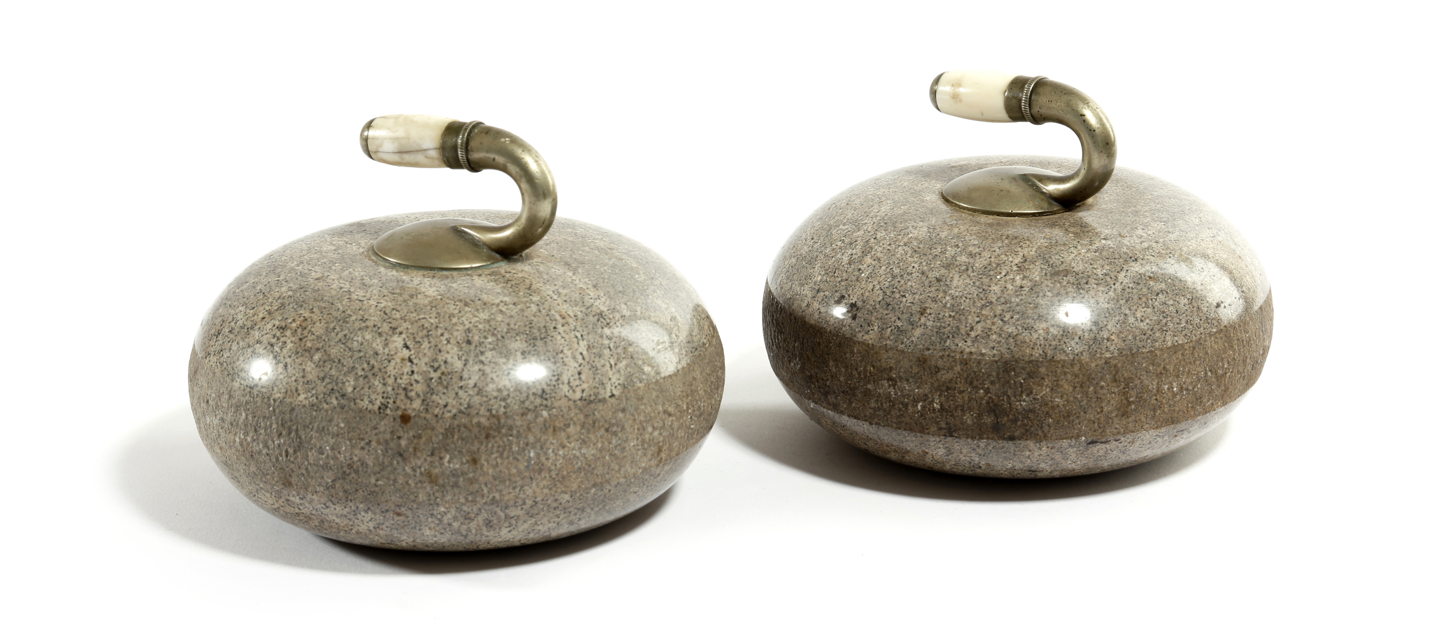 A PAIR OF SCOTTISH POLISHED GRANITE CURLING STONE DESK WEIGHTS
