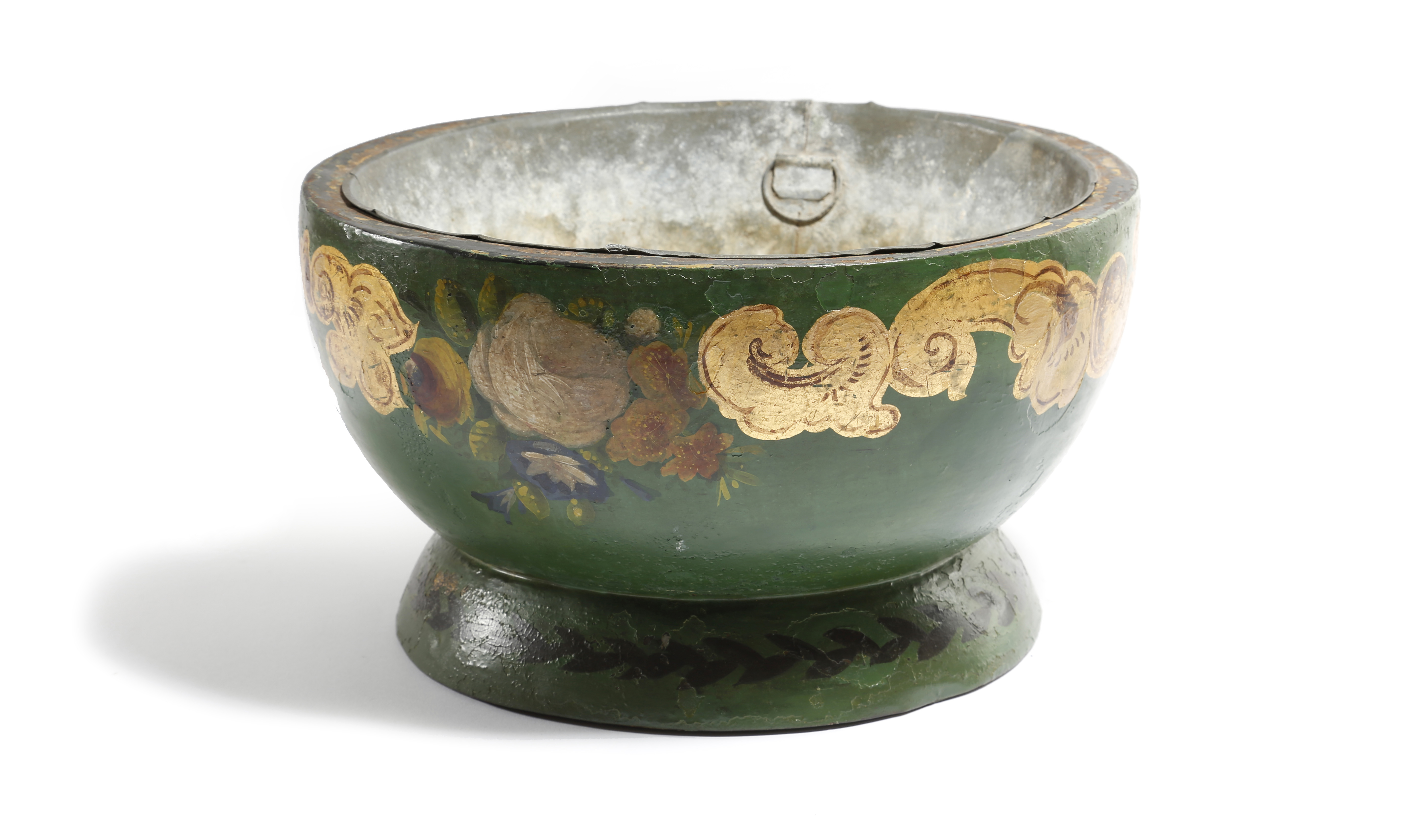 A GREEN TOLE PEINTE PLANTER 19TH CENTURY painted with roses and with parcel gilt and ebonised...
