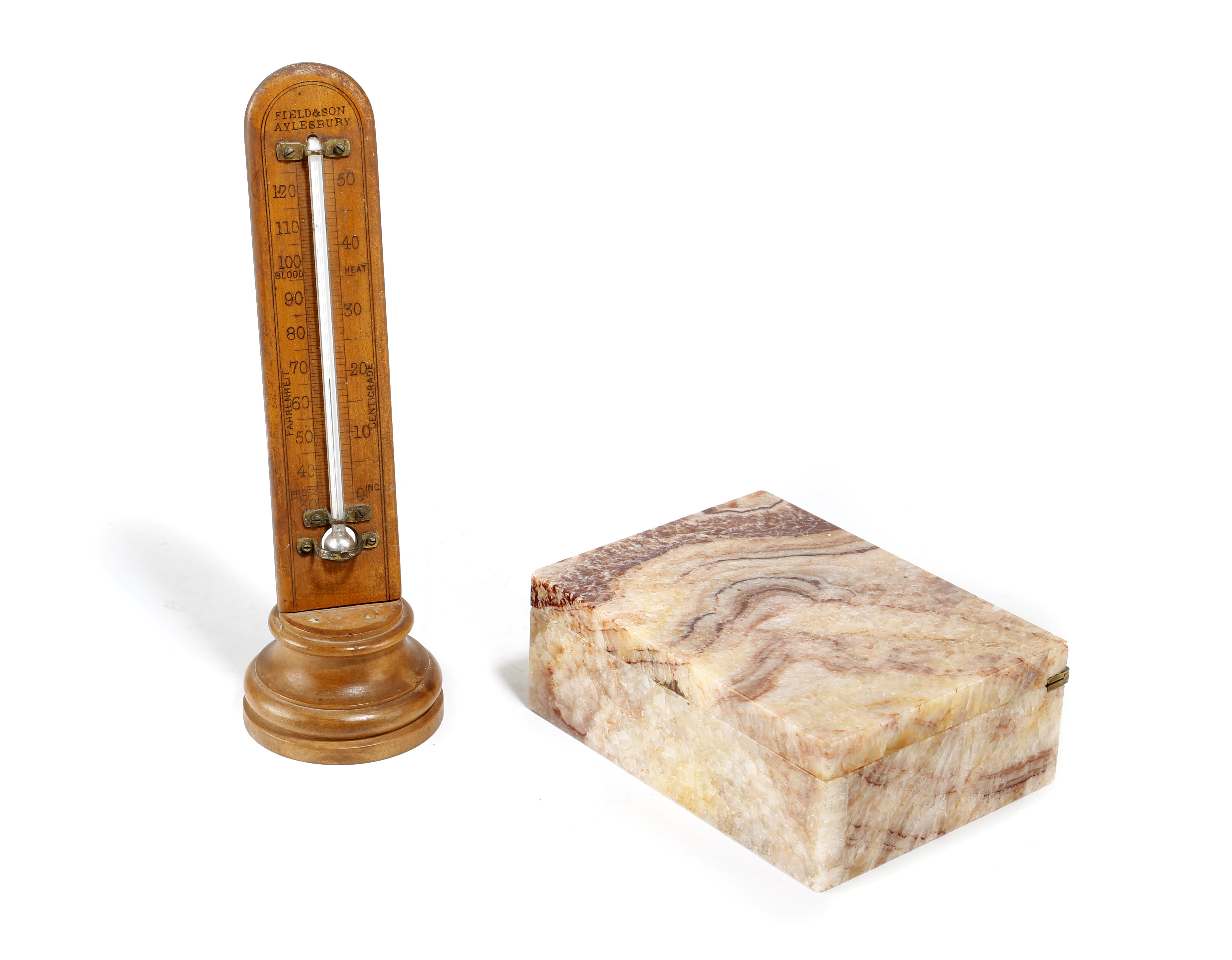 the brass hinge stamped 'Made In England', together with a desk thermometer by Field & Son, Aylesbury (2)