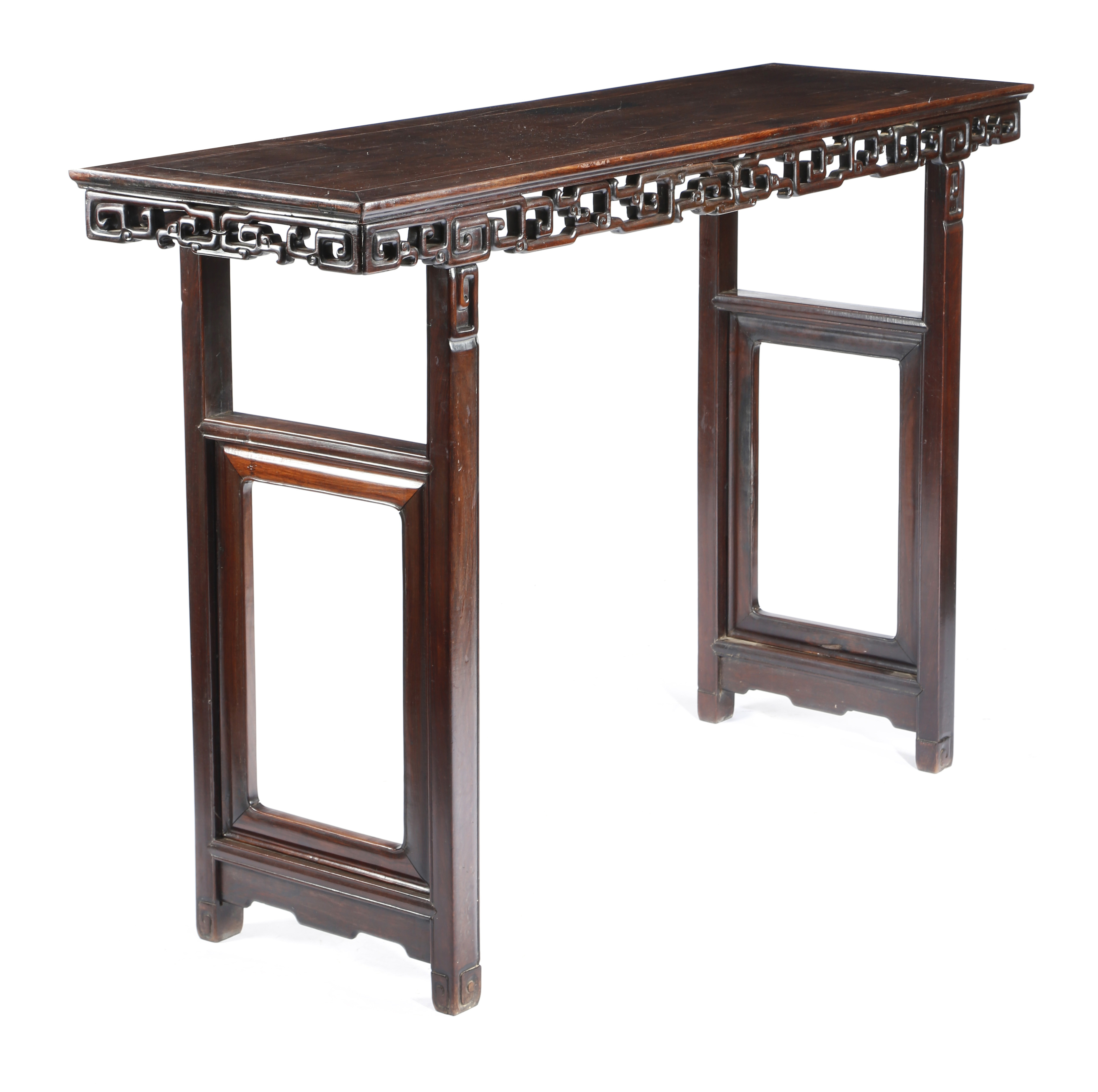 A CHINESE HARDWOOD ALTAR TABLE 19TH CENTURY the panelled rectangular top above a carved and...