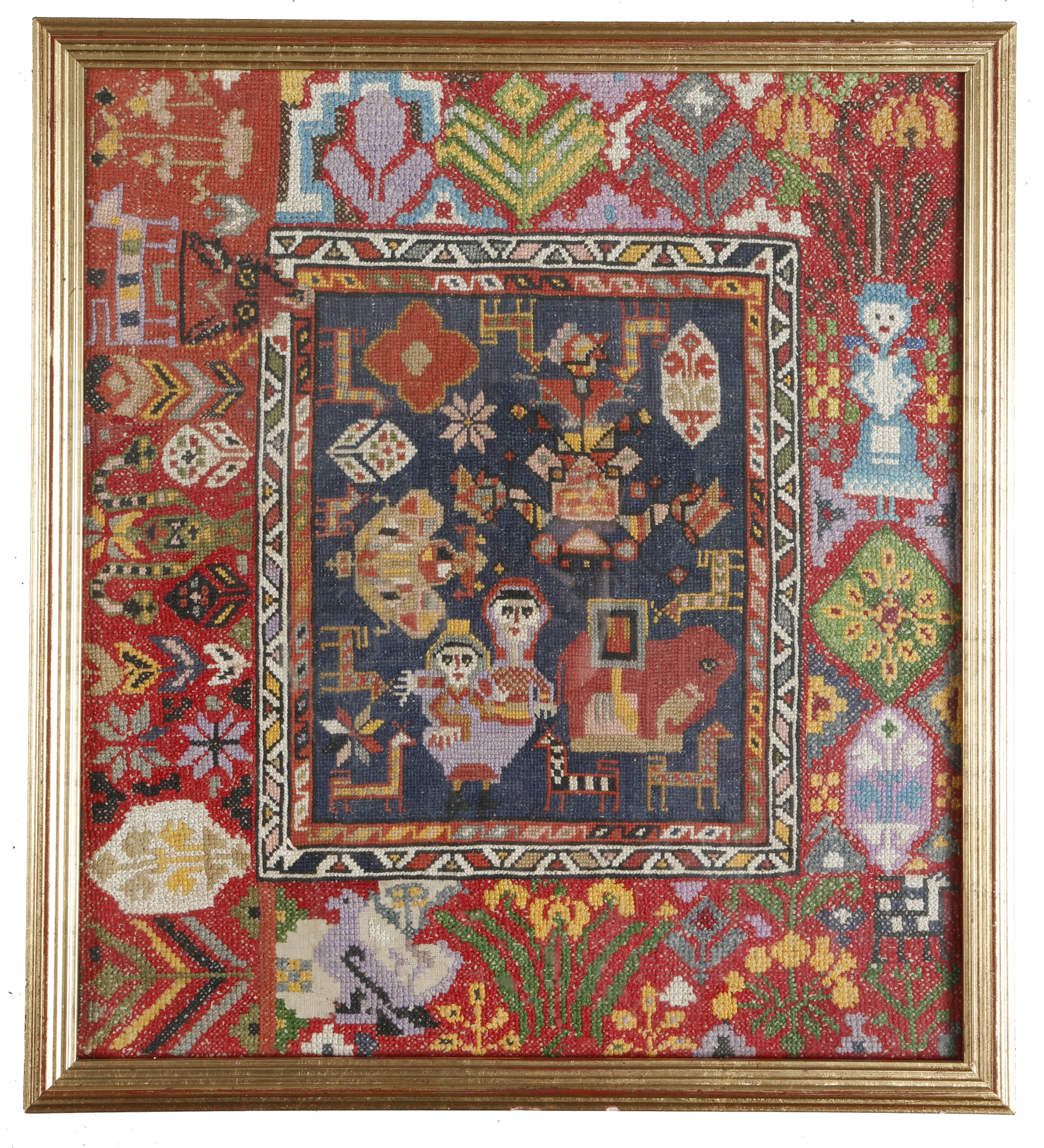 worked on a linen foundation with various different tribal and village design motifs, Caucasian, Azerbaijan, Swedish and Greek, including: an elephant, a donkey's head, figures, birds, flowers and leaves in a later gilt glazed frame