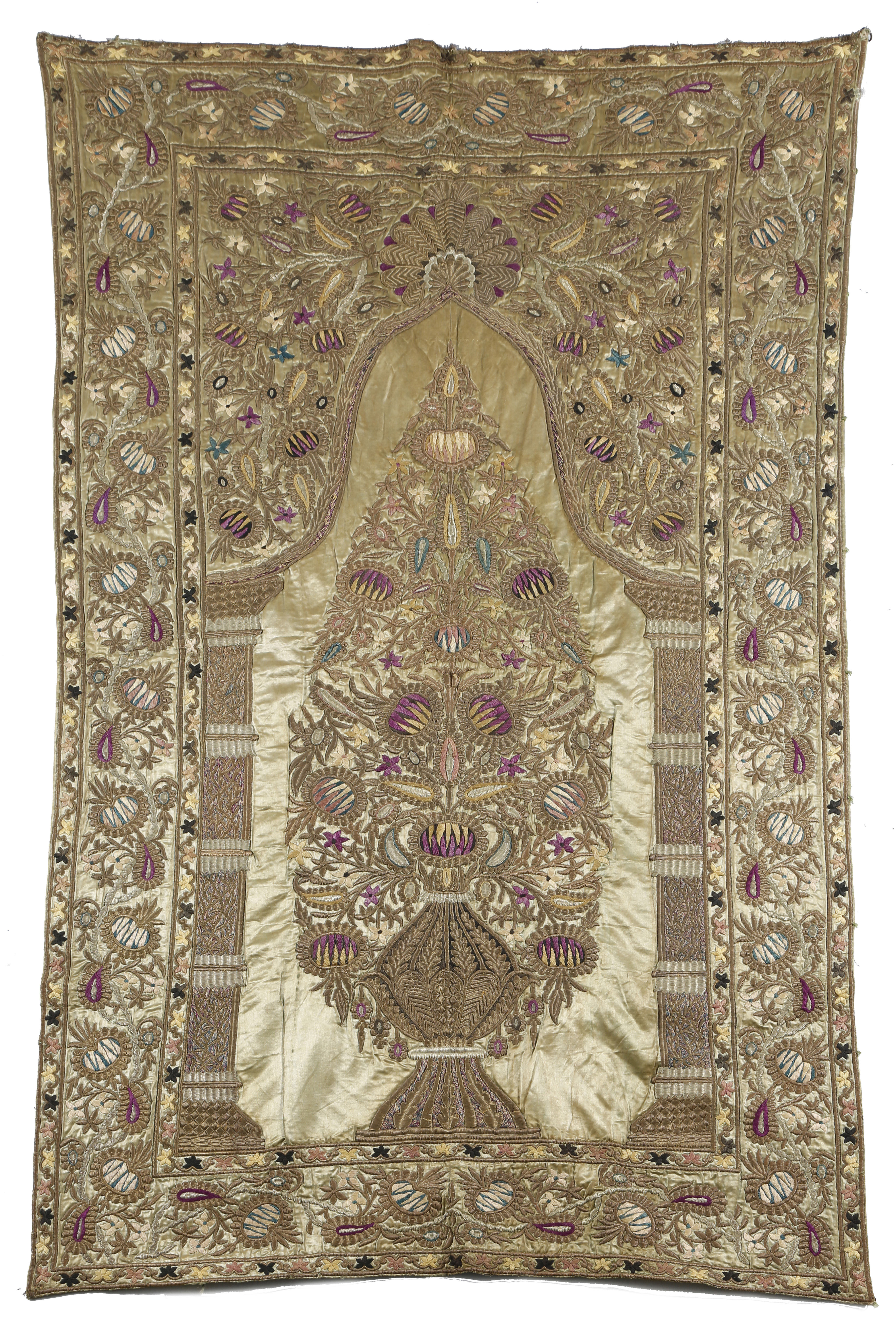 embroidered in metal thread and silks with a flower filled urn beneath an arch with a pendant mosque lamp