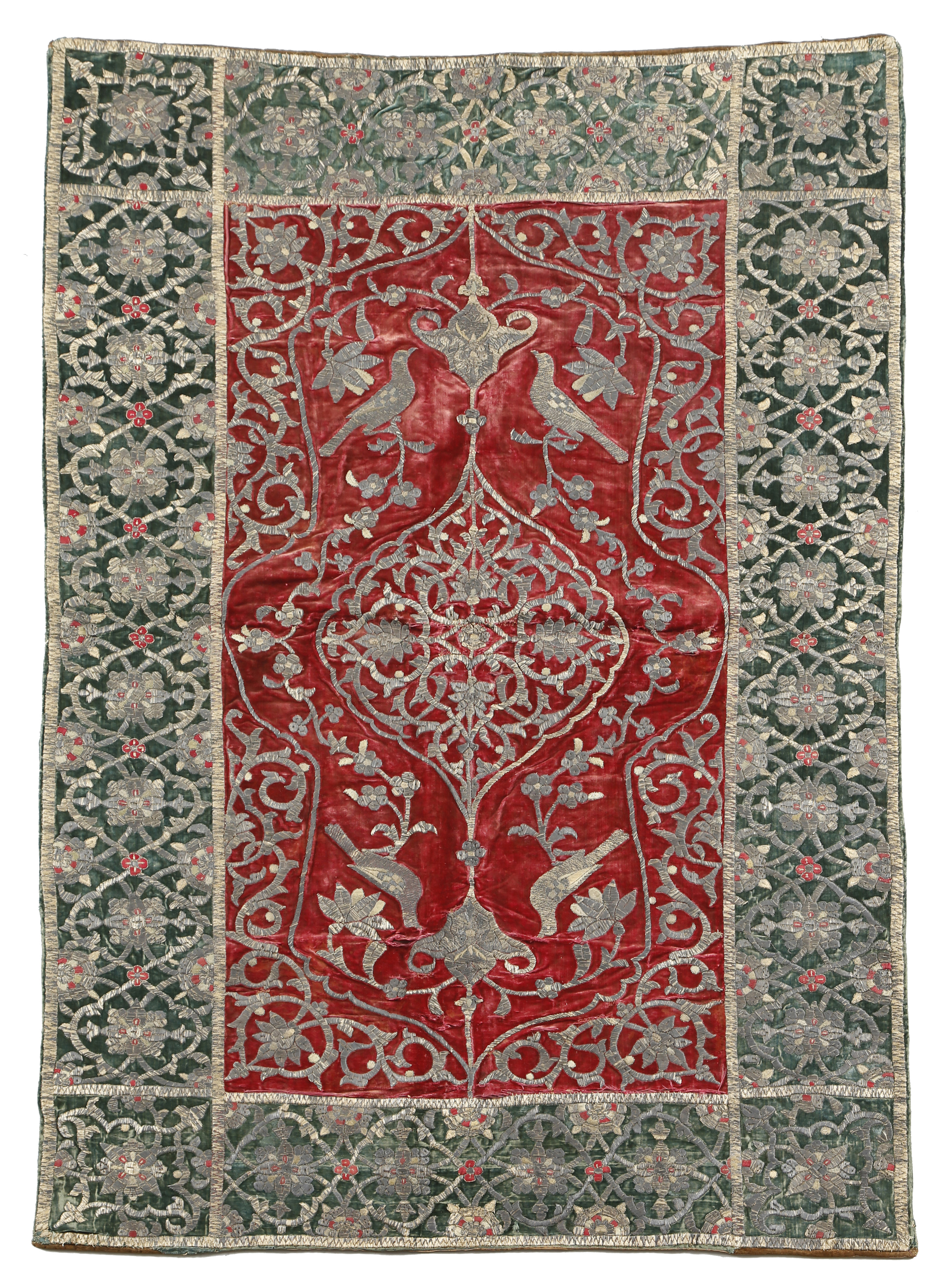 A DOUBLE NICHE PRAYER MAT OF GREEN AND RED VELVET