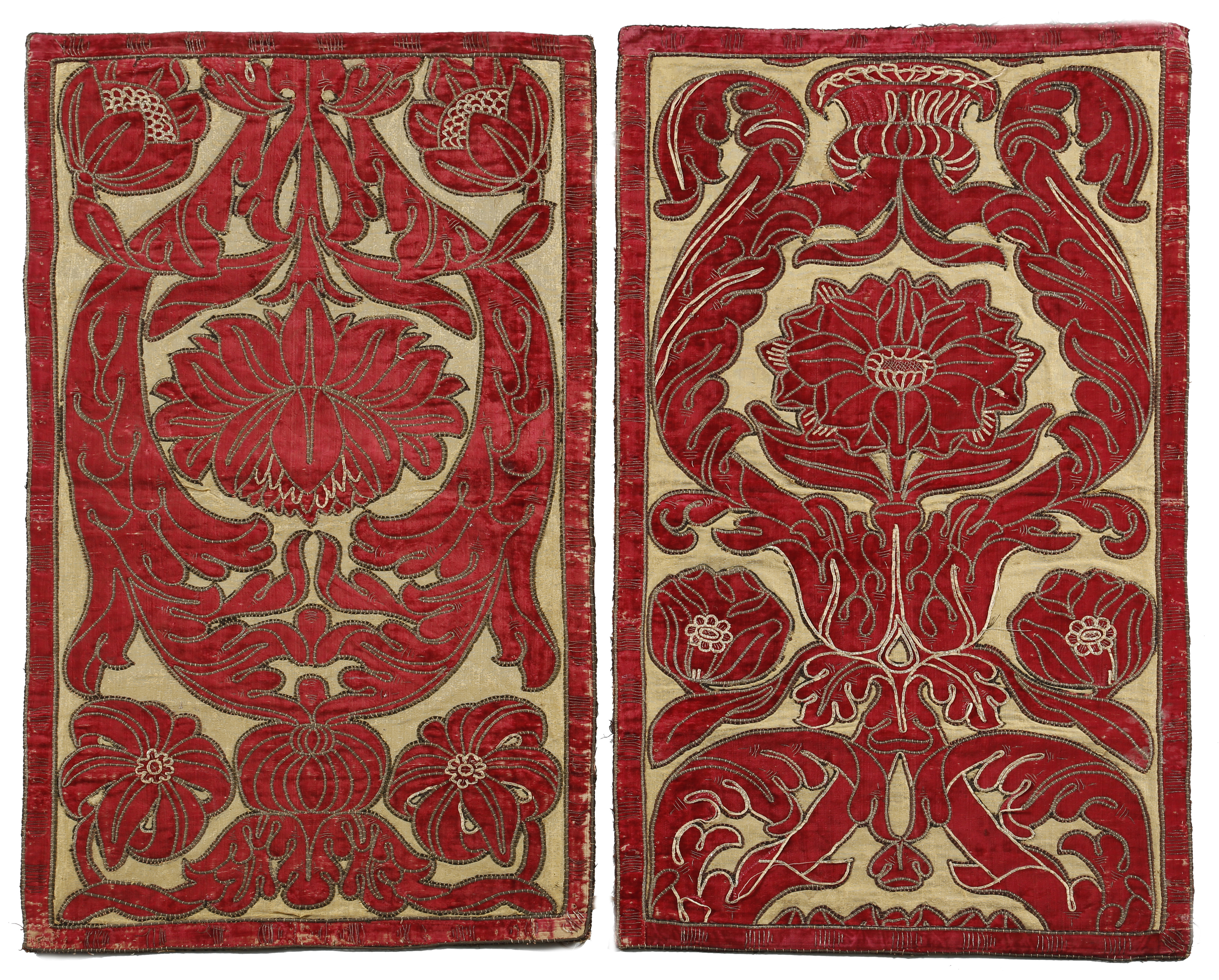 appliqued with red velvet large-scale flowers and scrolls, later backed (2)