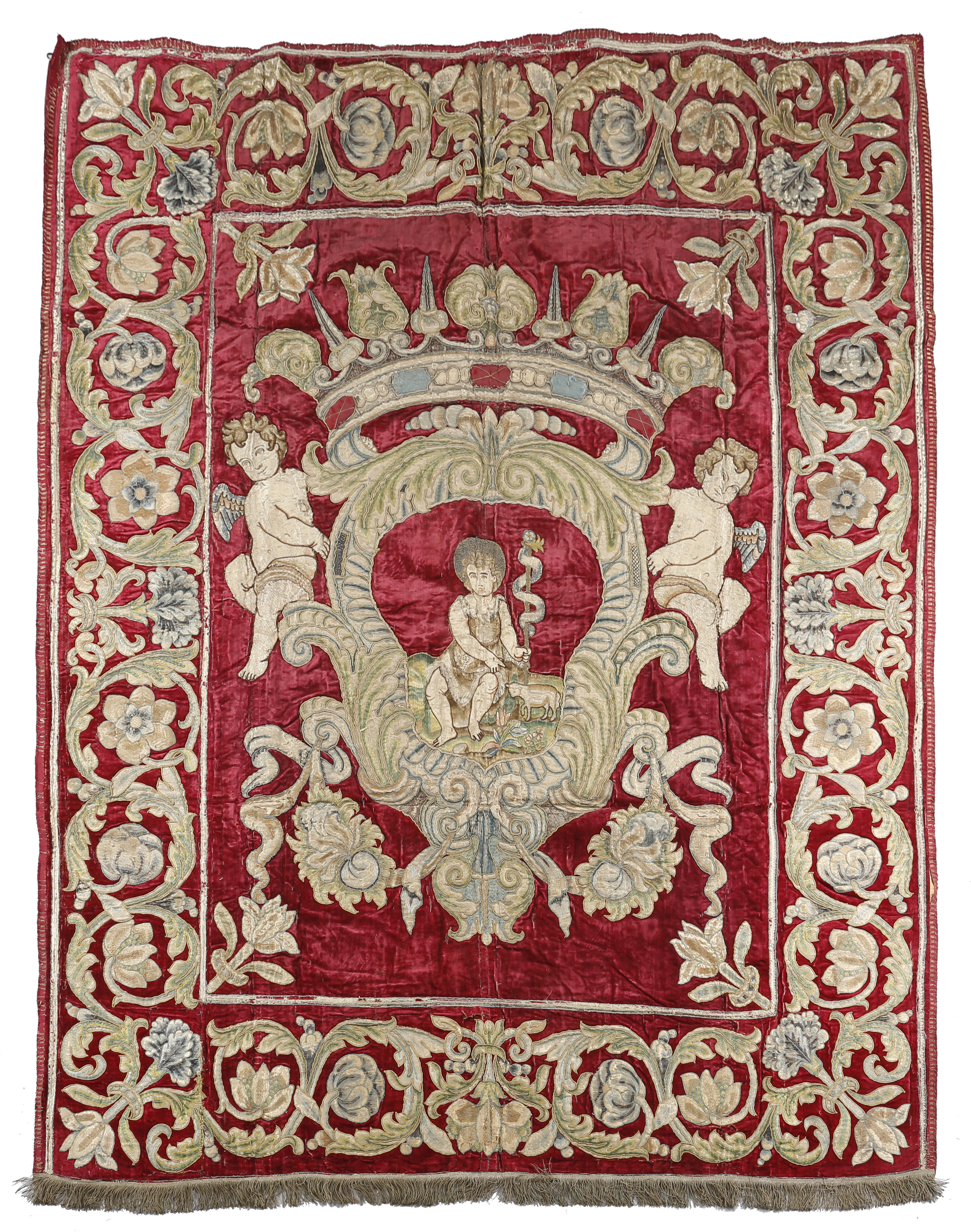 applique with a border of scrolling flowers, the centre with two putti holding up a crown, with the Christ child beneath with a lamb