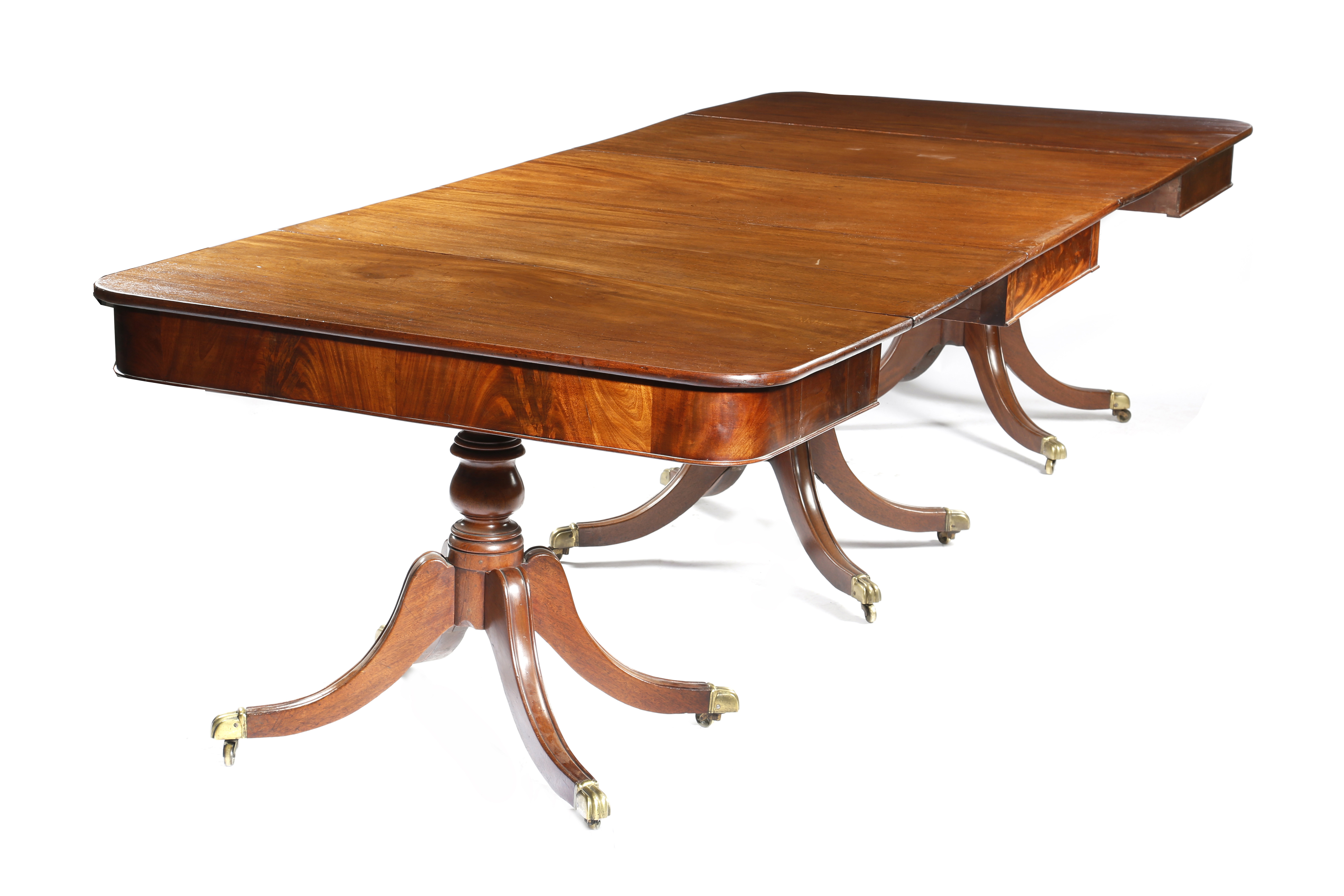A GEORGE IV MAHOGANY TRIPLE PILLAR DINING TABLE EARLY 19TH CENTURY with a pair of 'D' ends and a...