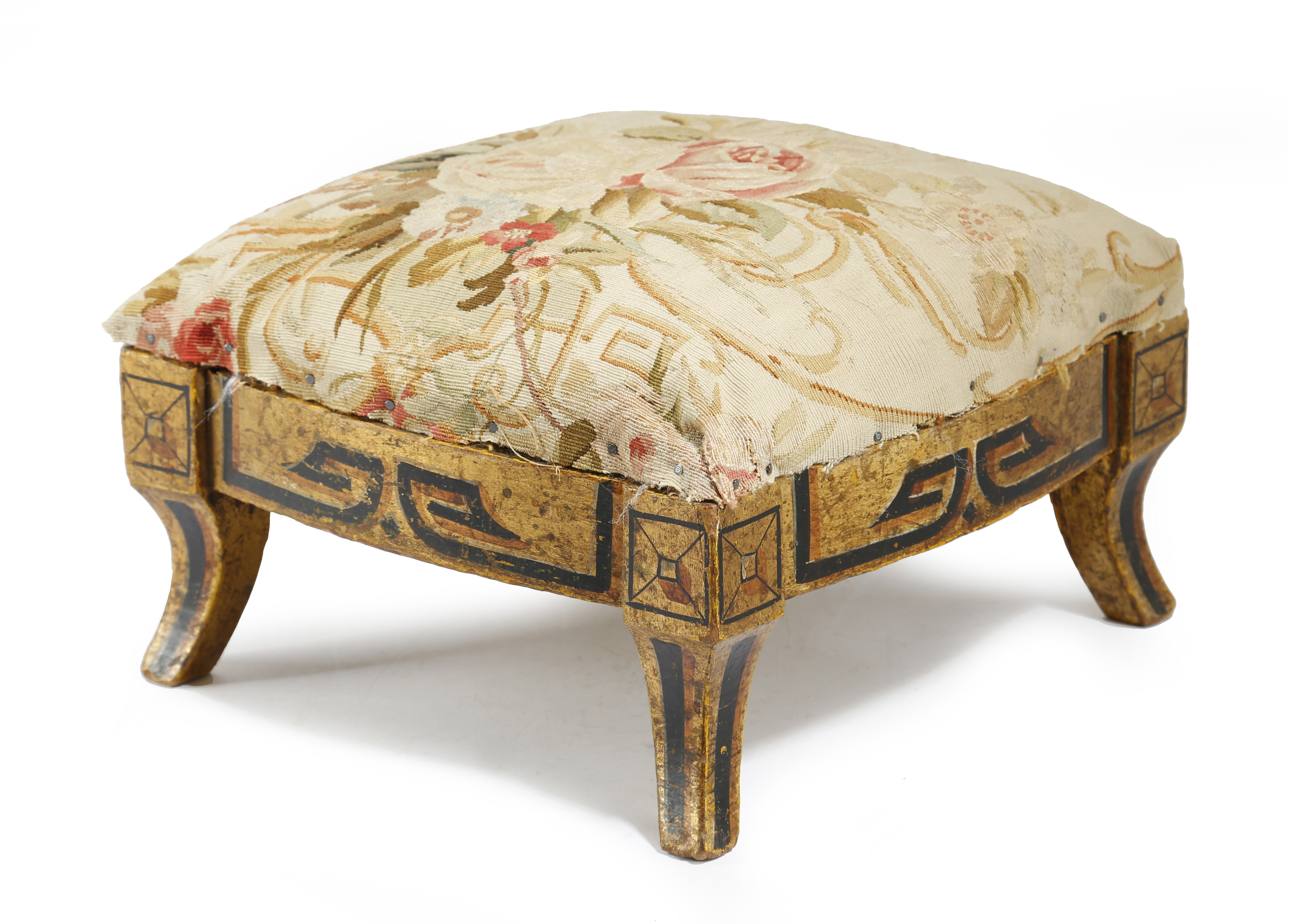 A SMALL GILTWOOD STOOL IN REGENCY STYLE POSSIBLY EARLY 19TH CENTURY with a later Aubusson floral...
