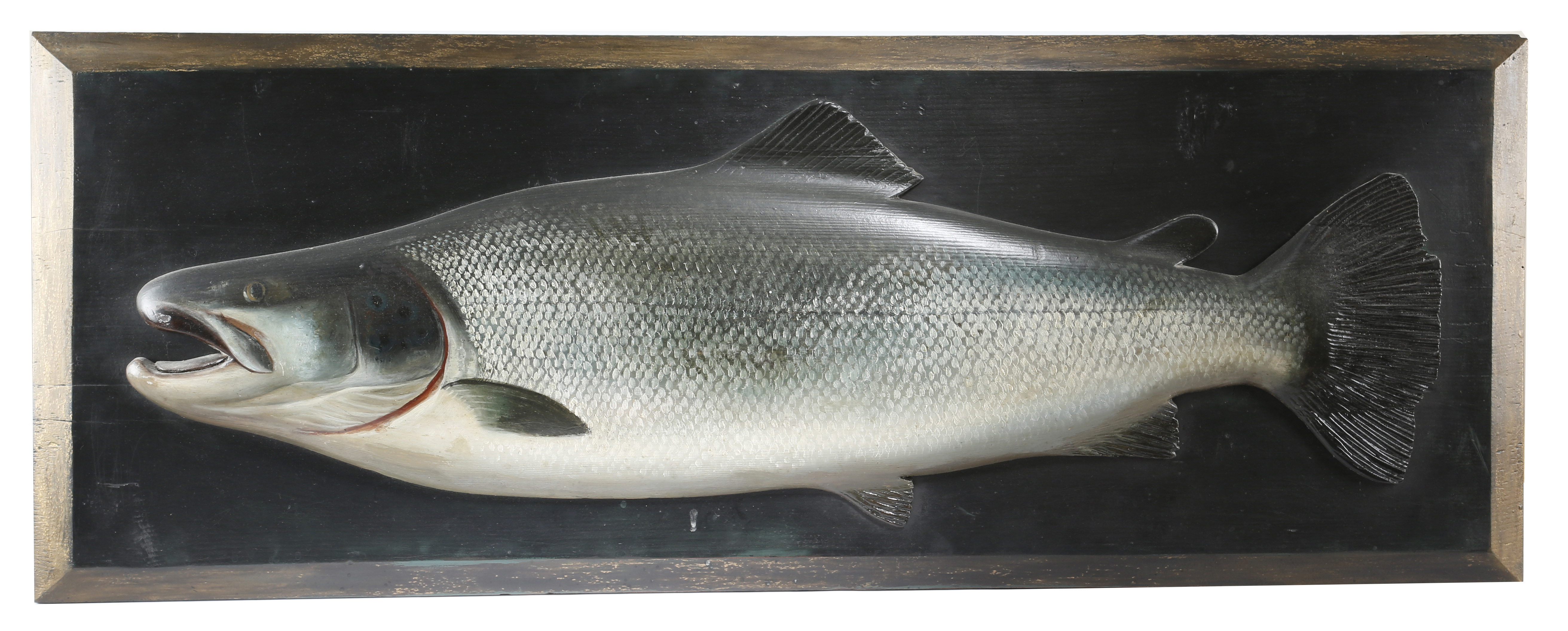 A RARE VICTORIAN CARVED AND PAINTED WOOD HALF-BLOCK FISHING TROPHY MODEL OF A SALMON ATTRIBUTED TO JOHN RUSSELL