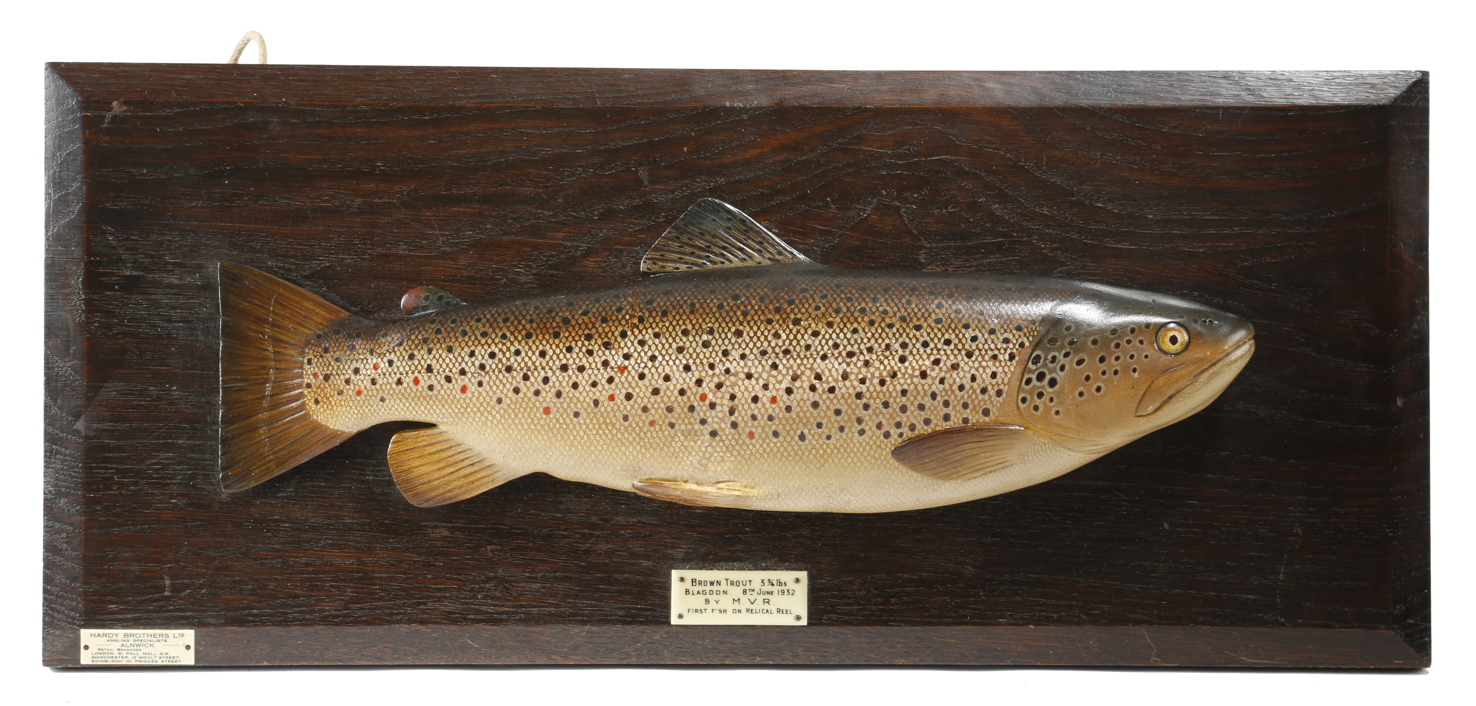 with two ivorine plaques, one inscribed 'Brown trout 3 and 3 quarter lbs, Blagdon, 8th June 1932 by M.V. R. first fish on helical reel', the other a trade label, inscribed 'Hardy Brothers Ltd, Angling Specialists, Alnwick....', mounted on an oak board