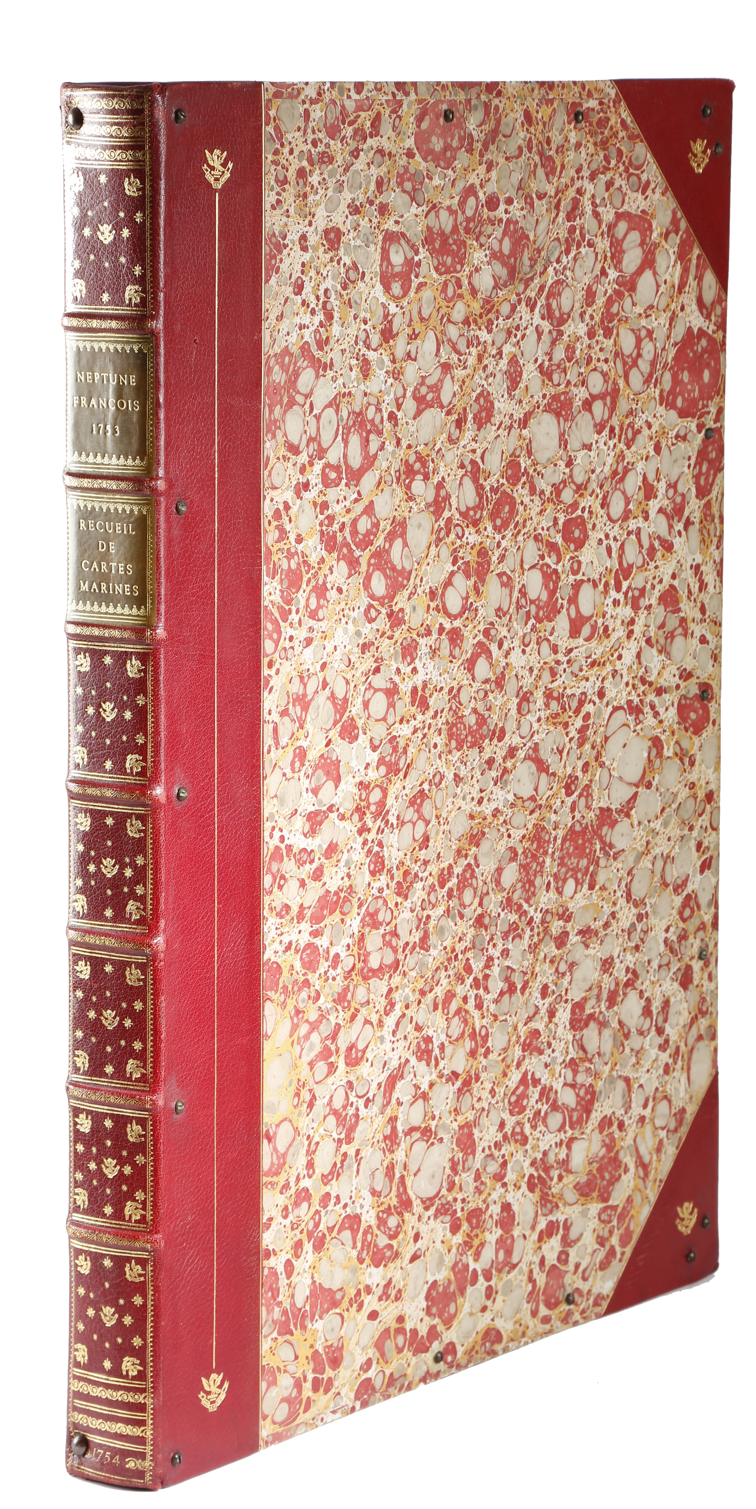 the spine inscribed 'Neptune Francois 1753 recueil de carts marines' and '1754' at the base, with gilt tooled decoration, with an eagle and laurel crest and the motto 'Pax et spes', hinged to reveal a vacant interior