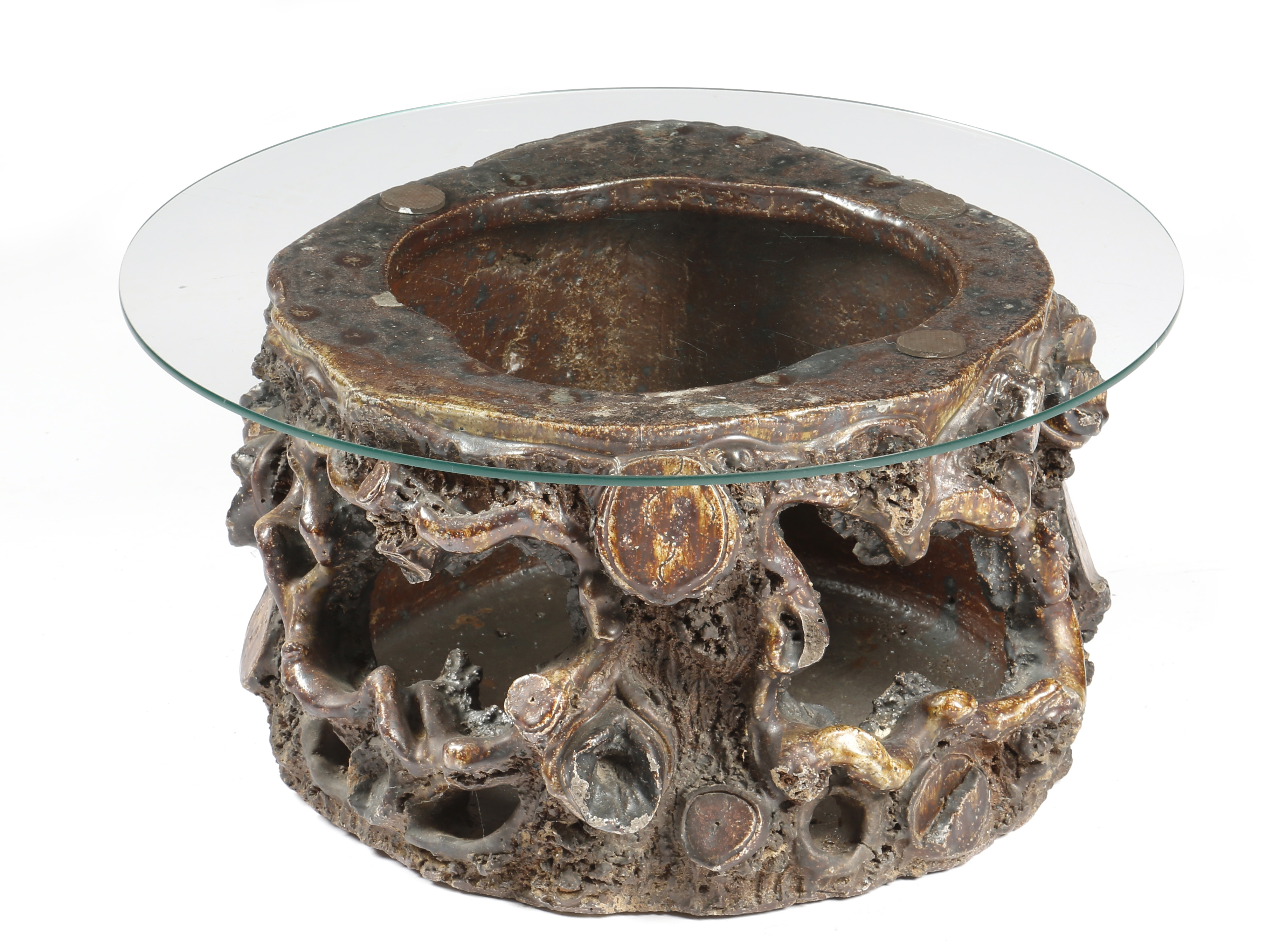 A 19TH CENTURY SALT GLAZED STONEWARE PLANTER in the form of a tree trunk