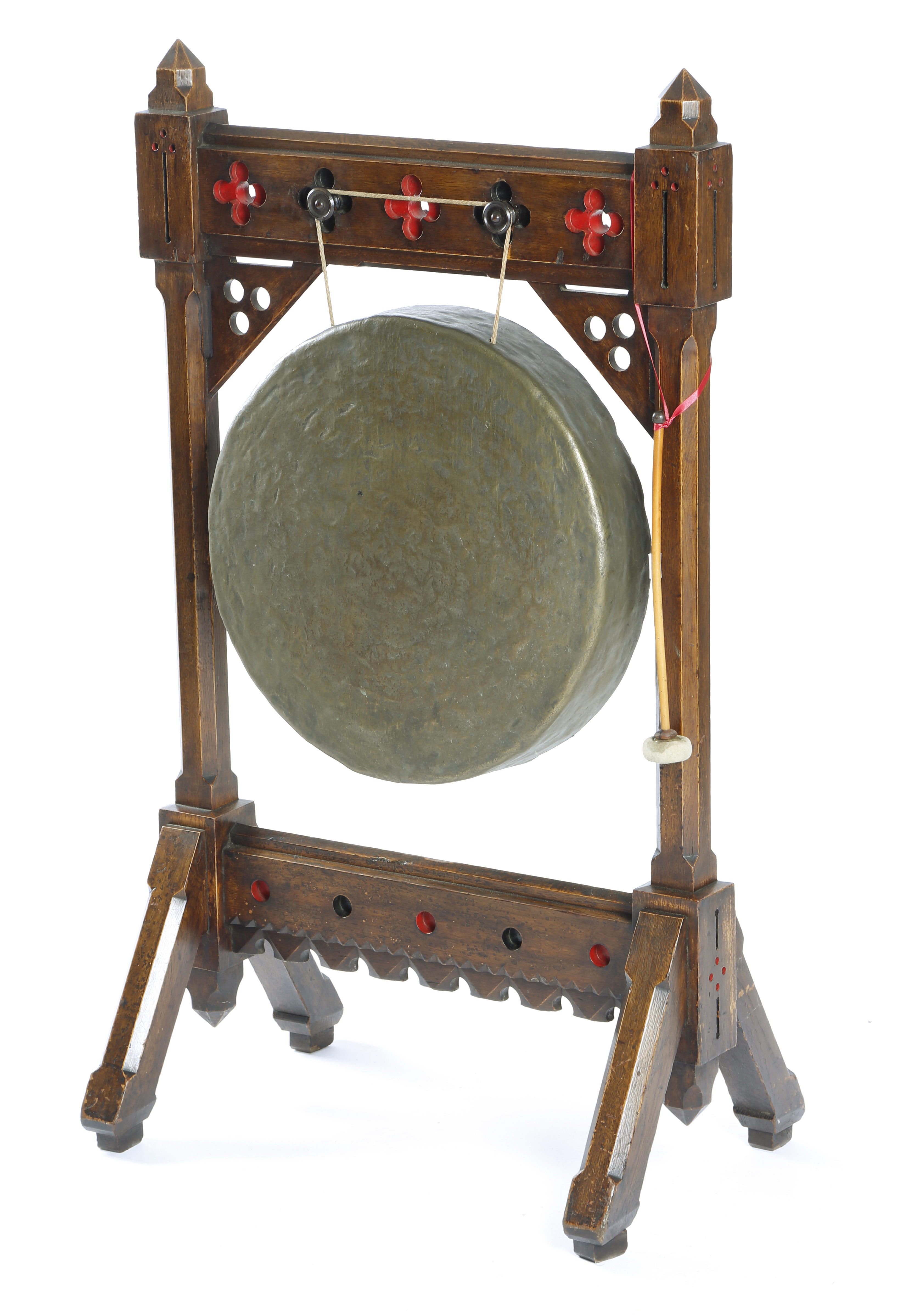 A LATE VICTORIAN OAK AND BRONZE GONG c.1880 in Gothic style