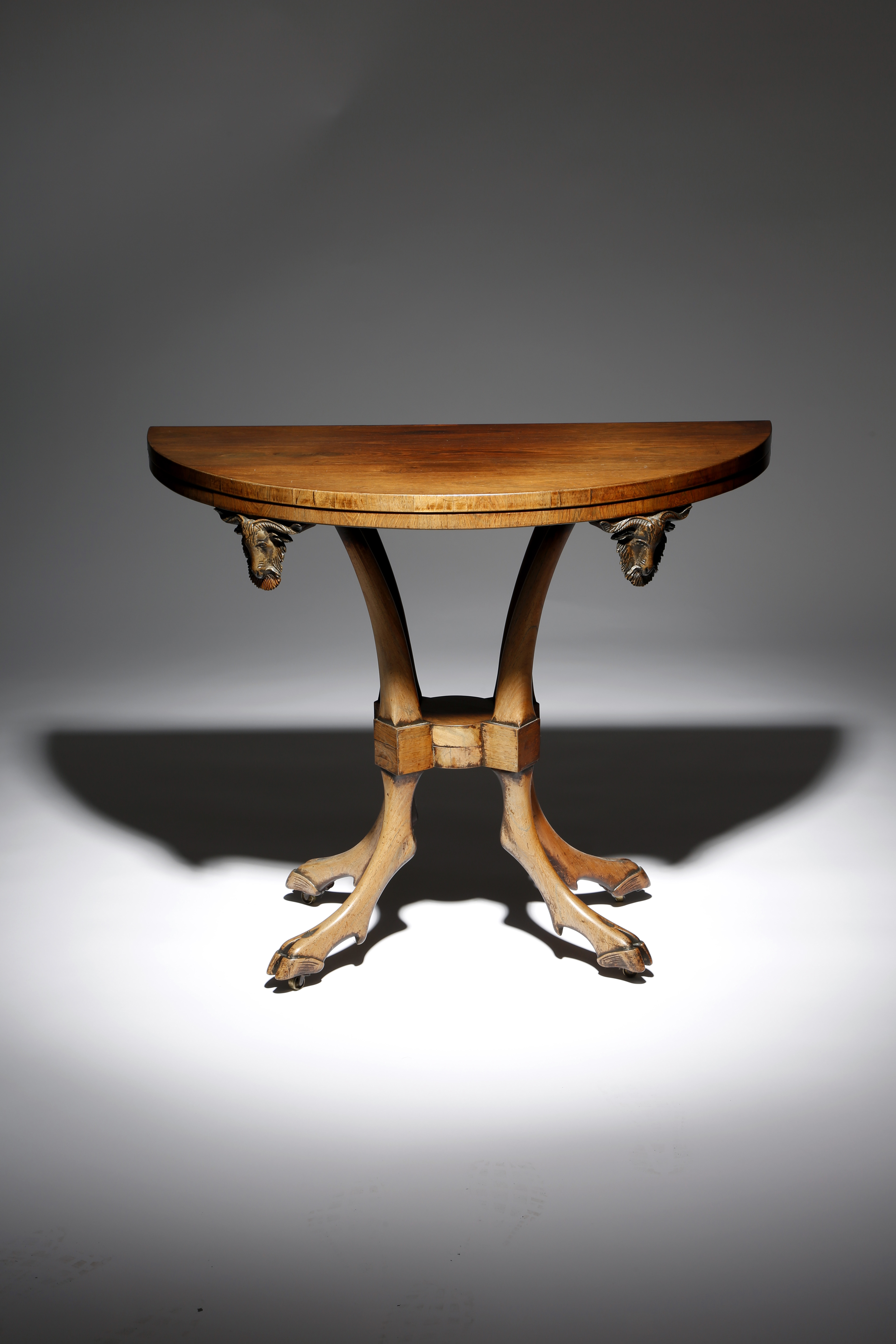 the hinged fold-over top on a scissor-action which rotates the supports, with carved ram's masks and four carved legs with hoof feet