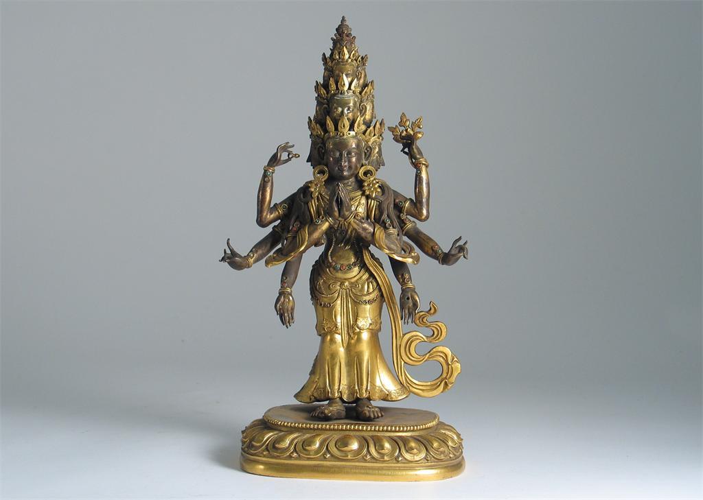 A Tibeto-Chinese gilt metal standing figure of Avalokitesvara, with many arms and many heads and inset with turquoise and coral, raised on a lotus throne, traces of cold paintwork, 18th century. Minor losses. 25.5cm.