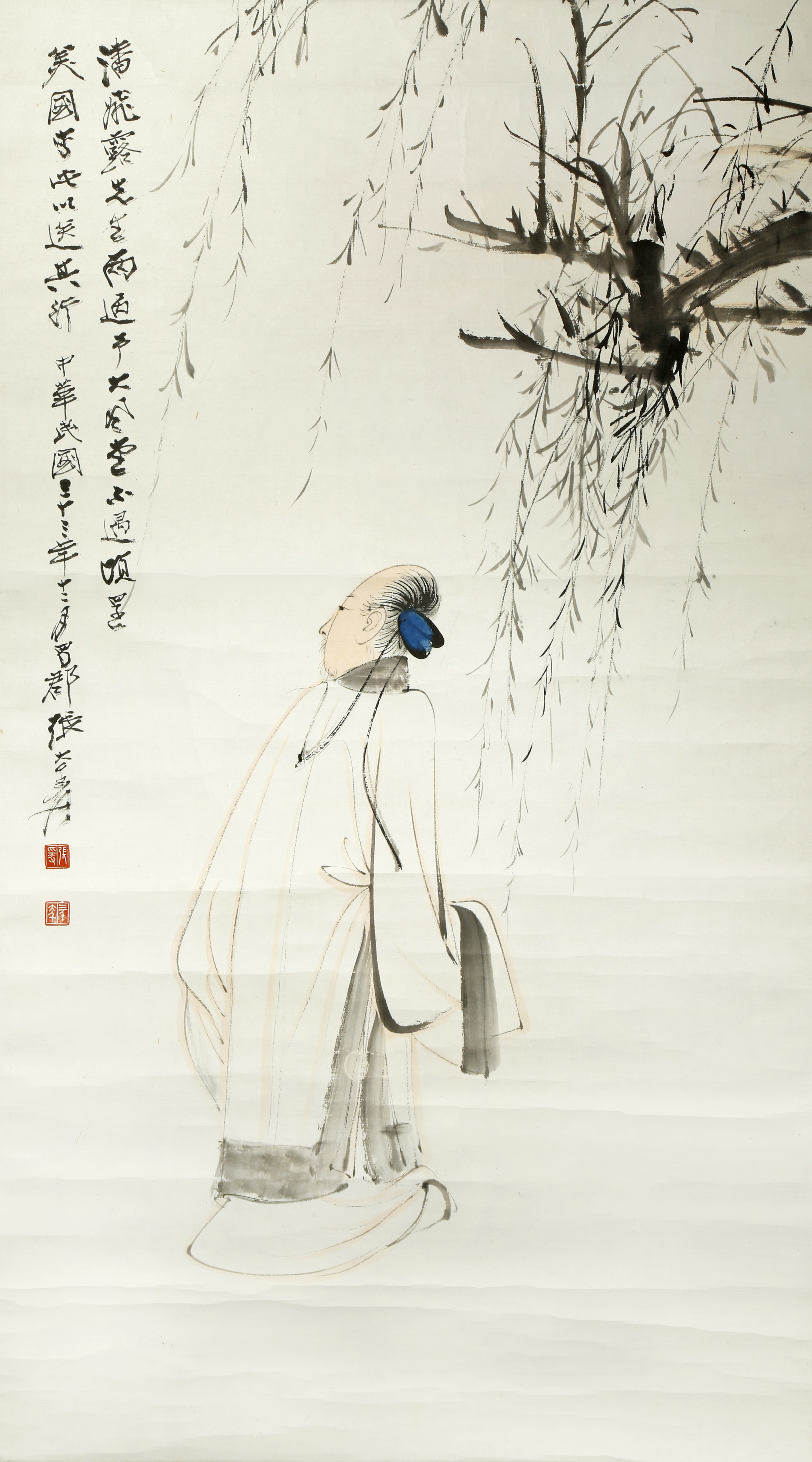 The image of a scholar under a willow tree represents friends saying goodbye. Breaking a willow branch to give to a leaving friend on their departure for a long journey is a custom which can be traced back to the Han dynasty (206 BC-AD 220), and the imagery is frequently used in Chinese literature. The idea is that once the friend has arrived at their destination, they can plant the broken willow branch and it will regrow into a tree at this new place. The Chinese character for the word 'willow tree' is homophonous with the character liu, meaning 'to stay'. Gifting a willow branch is therefore a gesture of asking the departing friend to stay as well as a way of showing how they will be missed and expressing good wishes for the future. This painting by Zhang Daqian (1899-1983) was a gift to his friend the late James Kedzie Penfield (1908-2004) before Mr Penfield's return to the United States from China. Mr Penfield visited Zhang Daqian's studio twice before leaving, but he was out both times and so they were unable to say goodbye in person. With regret and a heavy heart, Zhang Daqian painted this picture depicting himself as a scholar underneath a willow tree as a means of saying farewell and wishing his old friend all the best for the future.