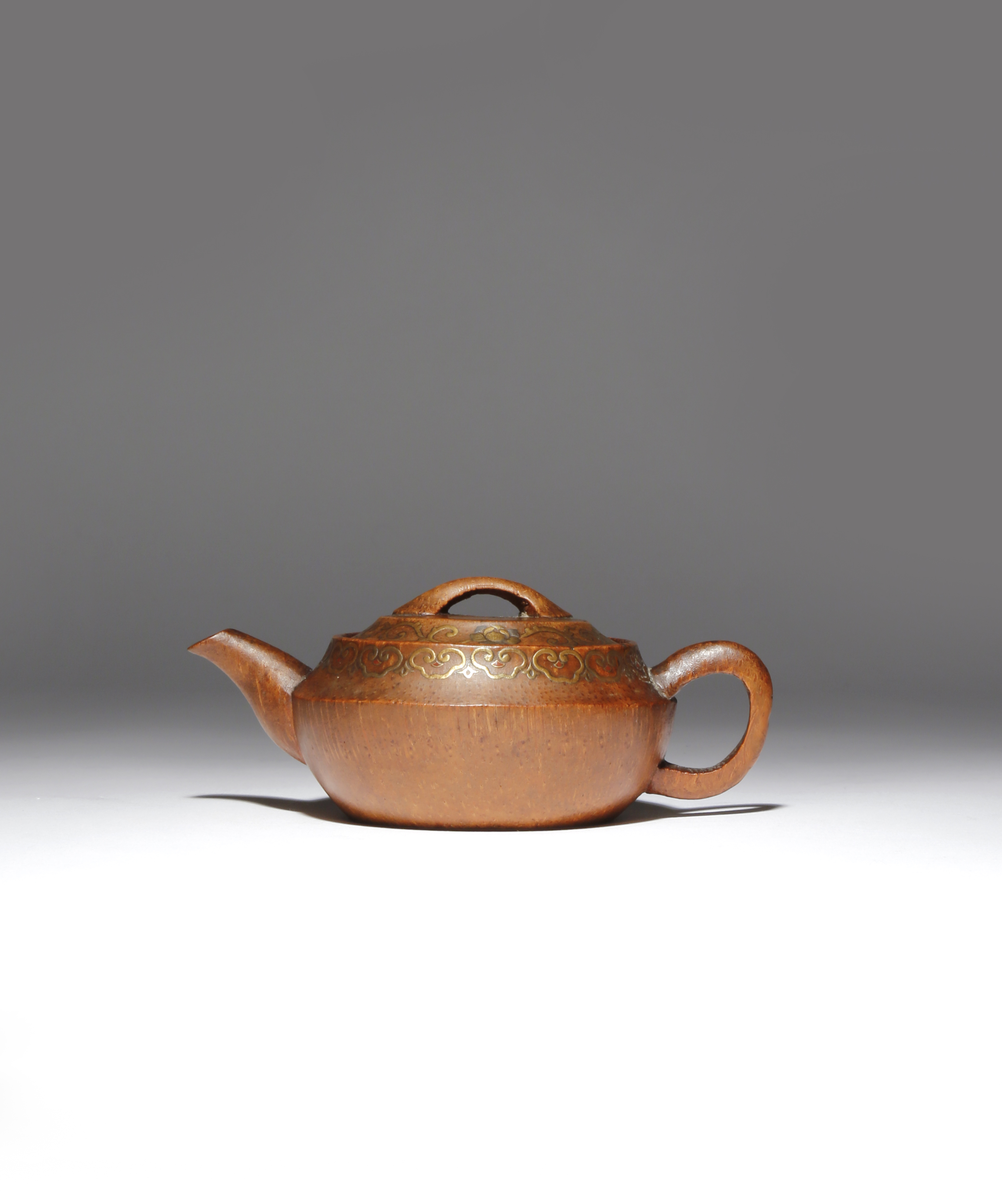 Cf. Christie's Hong Kong, 2nd December 2015, lot 3139 for another bamboo root teapot and cover with this mark; see also Bonhams Hong Kong, 28th November 2011, lot 250 for a Yongzheng Yixing inkstone and lacquer box decorated with comparable gilt scrolls.