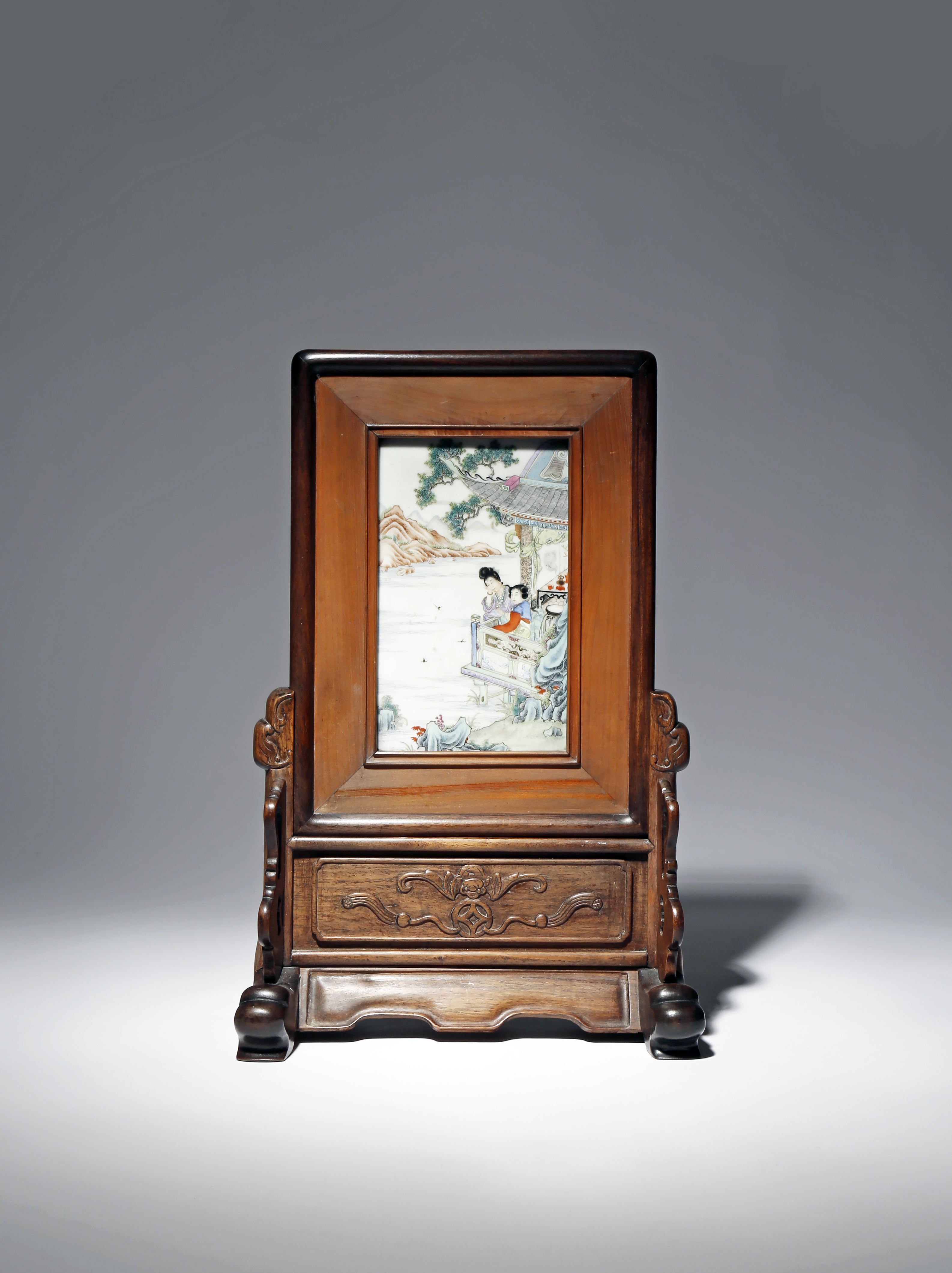 A CHINESE FAMILLE ROSE TABLE SCREEN REPUBLIC PERIOD Painted with a scene of two ladies gazing at...