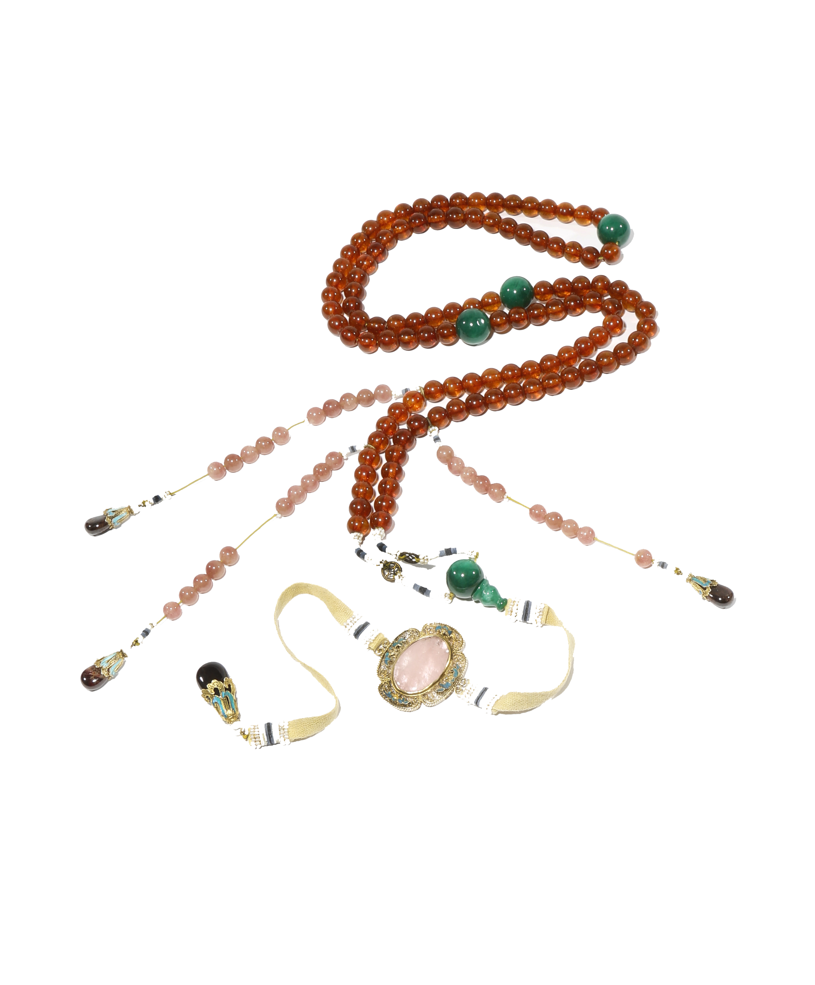 Formed from four sections of twenty-seven amber beads divided by large fodou, the central fodouda carved as a gourd which suspends an oval rose quartz plaque, the plaque mounted in filigree decorated with four bats highlighted in kingfisher feathers, the upper section with three zhinian of small rose quartz beads, with four further hardstones carved as fruits mounted in filigree also with areas picked out in kingfisher feather, 116cm.