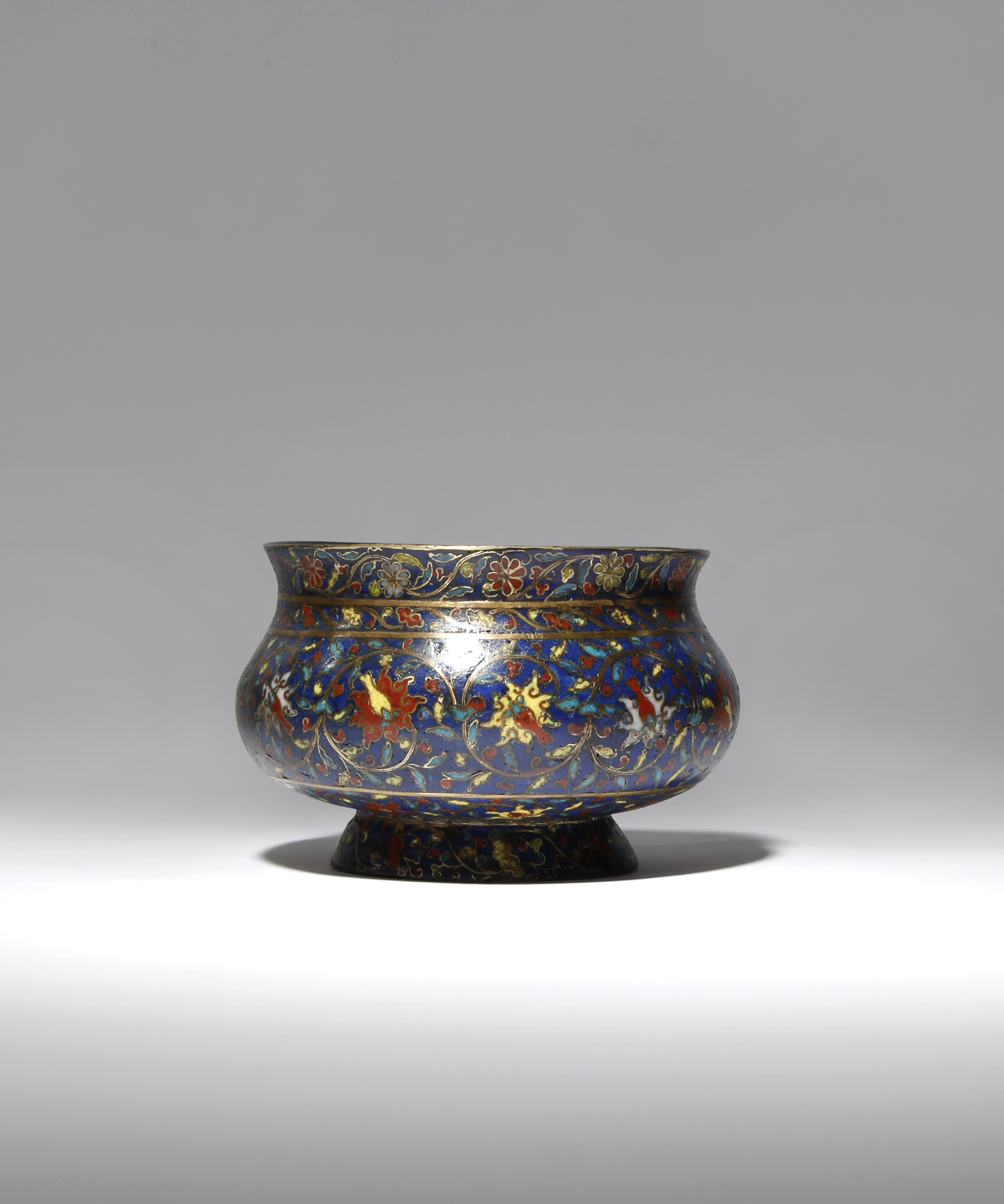 A CHINESE CLOISONNE 'LOTUS' INCENSE BURNER MING DYNASTY The bombé-shaped body decorated with...