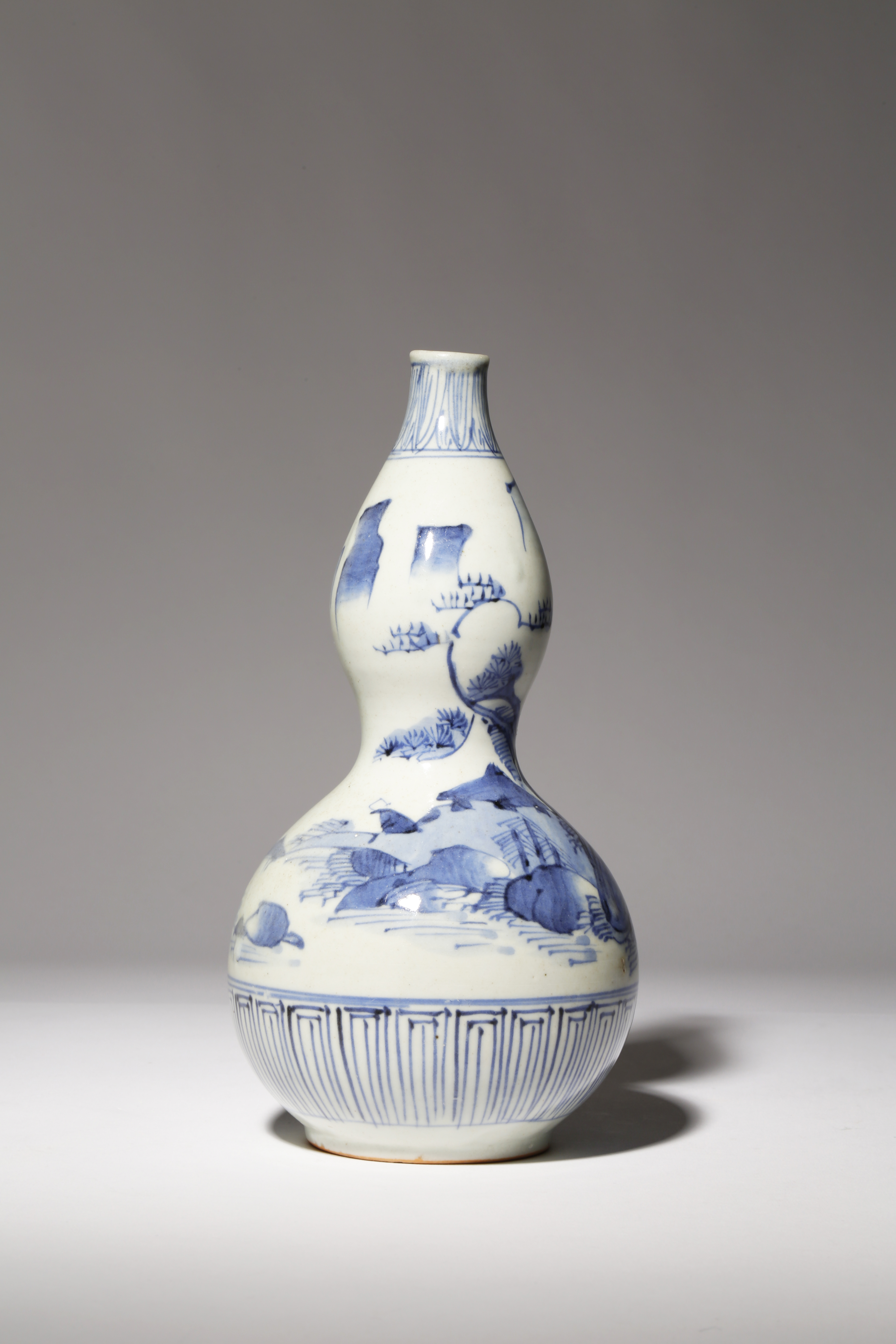 Shaped as a double gourd, the body decorated with a stylised mountainous river landscape, the neck and foot with bands of lappets, 21cm.