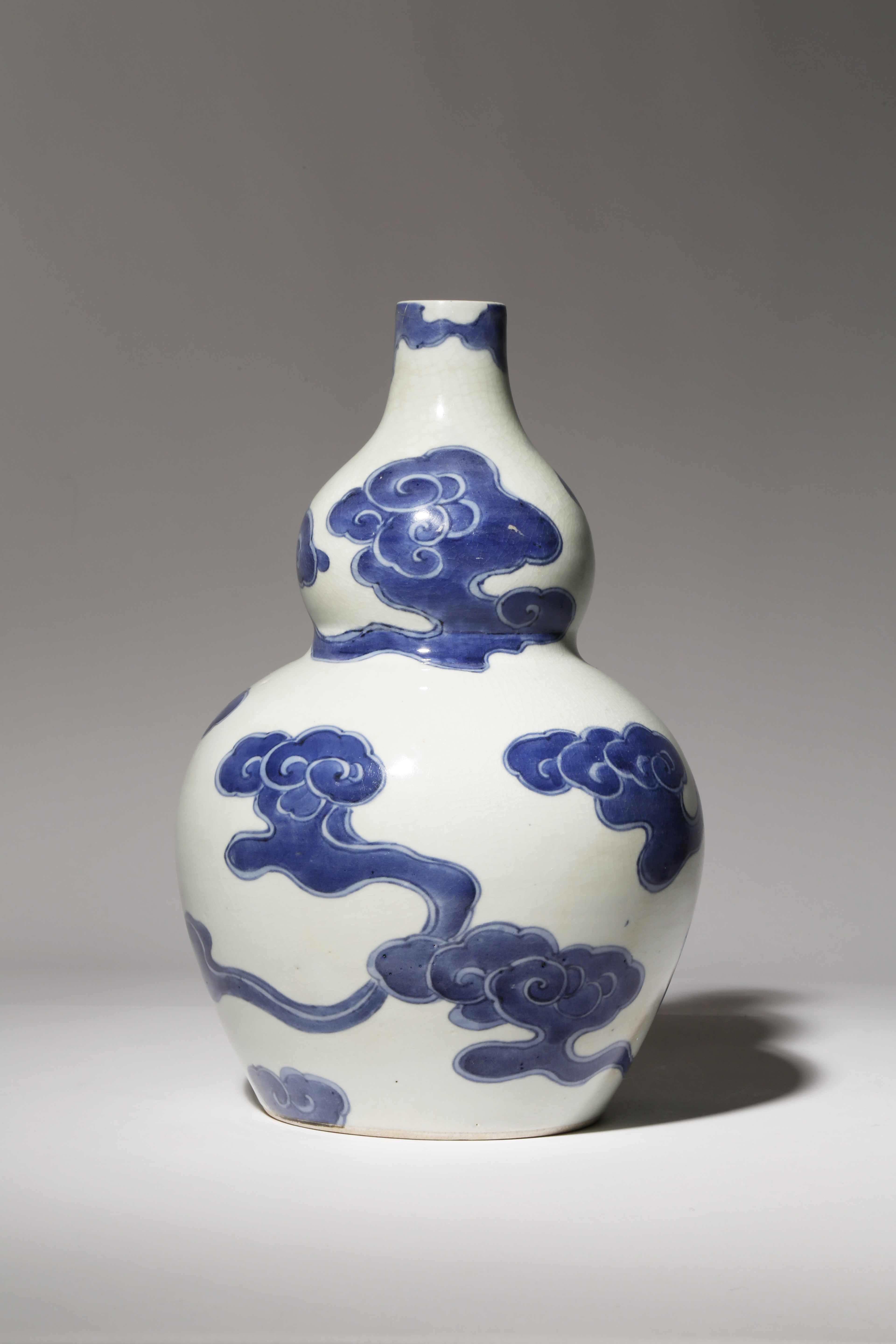Shaped as a double gourd, the body decorated with a continuous design of scrolling clouds and wisps of mist on a creamy-white ground, 26cm.