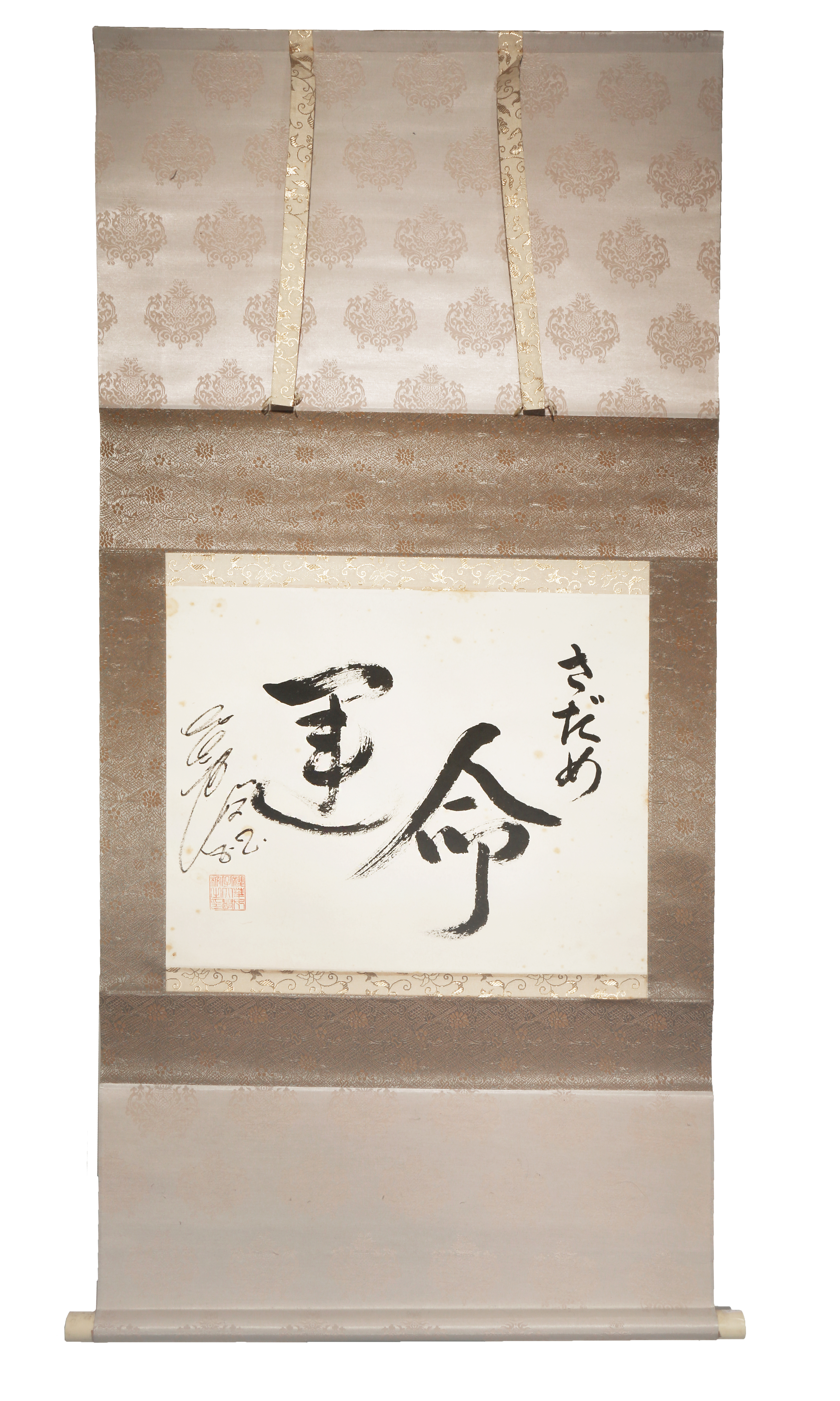 In ink on paper, with the characters for sadame (fate) written in hiragana and kanji scripts, signed to the left-hand side and with a red seal, 38.5cm x 48.5cm.