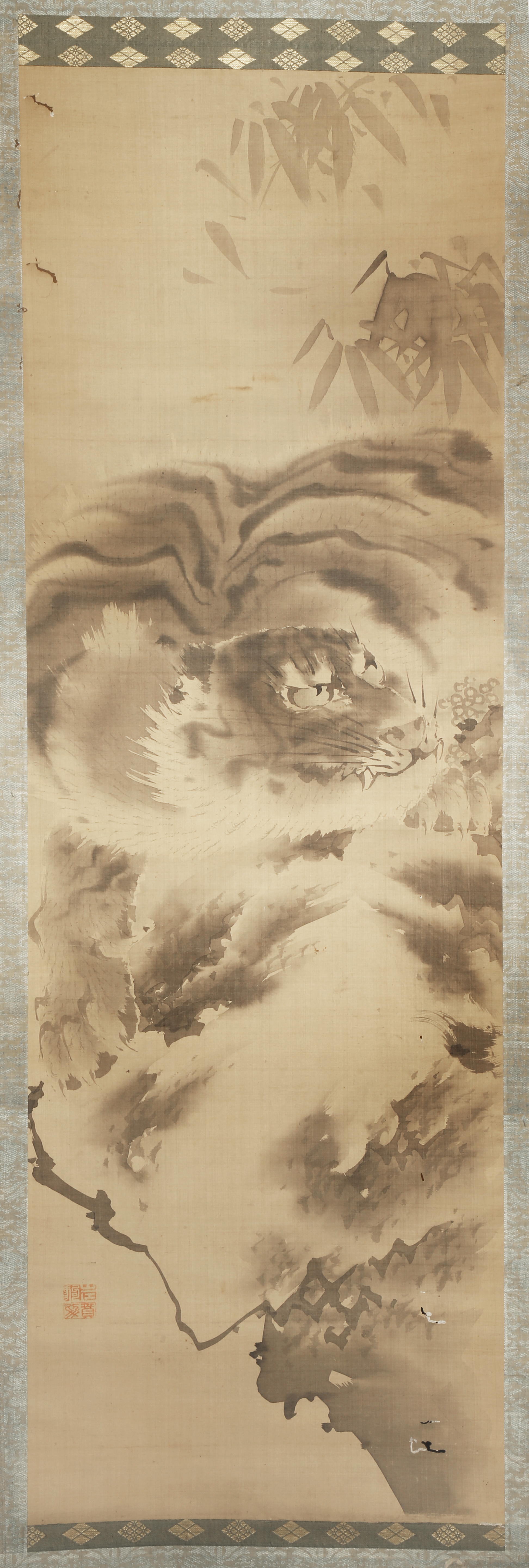 One depicting a kaleidoscope of butterflies fluttering on a bare ground, signed to the lower right corner and with two red seal marks, 108cm x 41cm, the other in the style of Kishi Ganku (1749-1839) and depicting a ferocious-looking tiger emerging from behind rockwork, with bamboo above, a red seal mark to the lower left cover, 98cm x 32cm. (2)