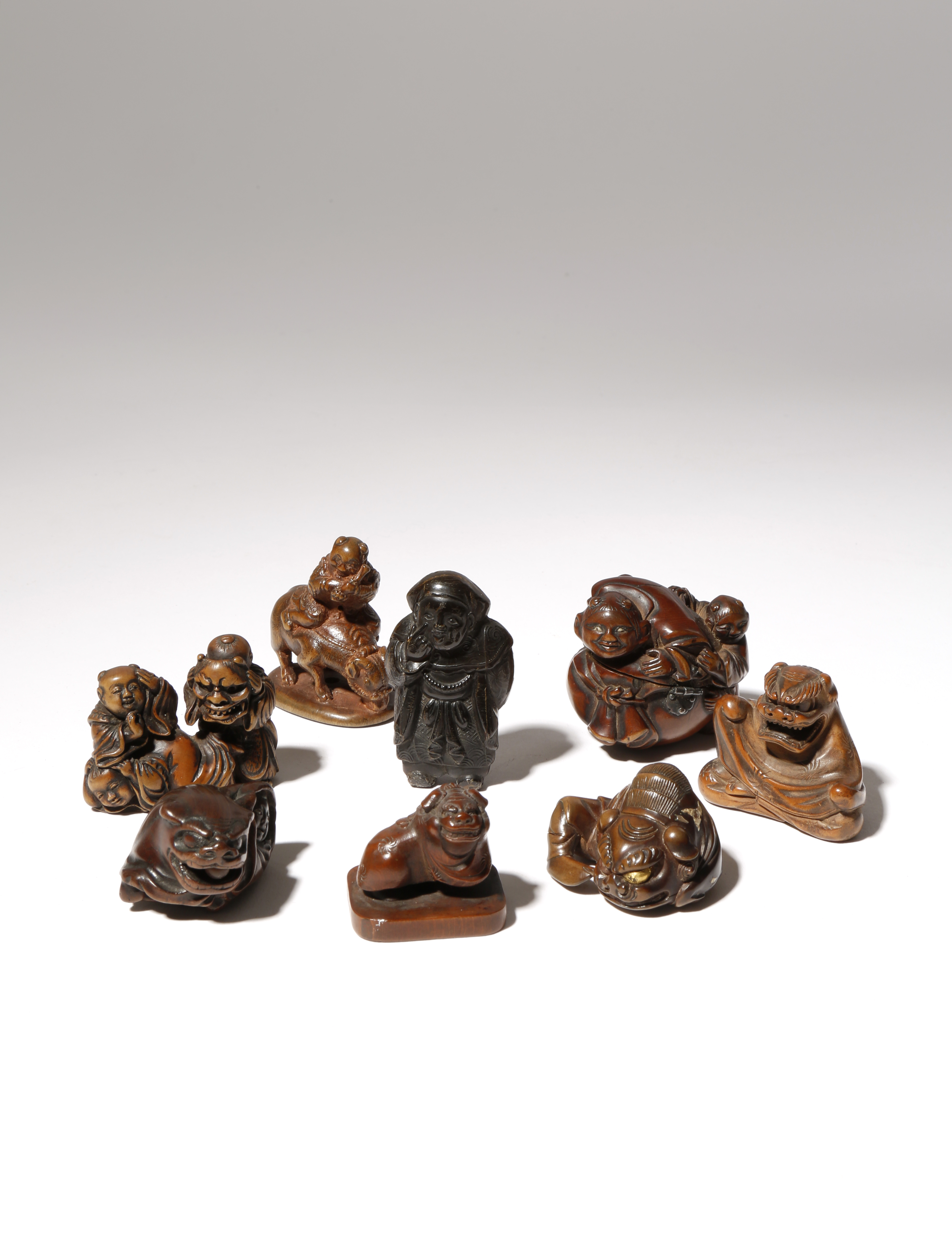 Depicted engaged in a variety of activities, five wearing lion masks for the shishi-mai dance and another riding an ox, together with a netsuke in resin of a child doing the akanbe gesture (pulling his eyelid and sticking his tongue out) and a small hinged box, possibly for tobacco, shaped as two children climbing on a large sack, some with signatures including Gyokuho, 5.6cm max. (8)