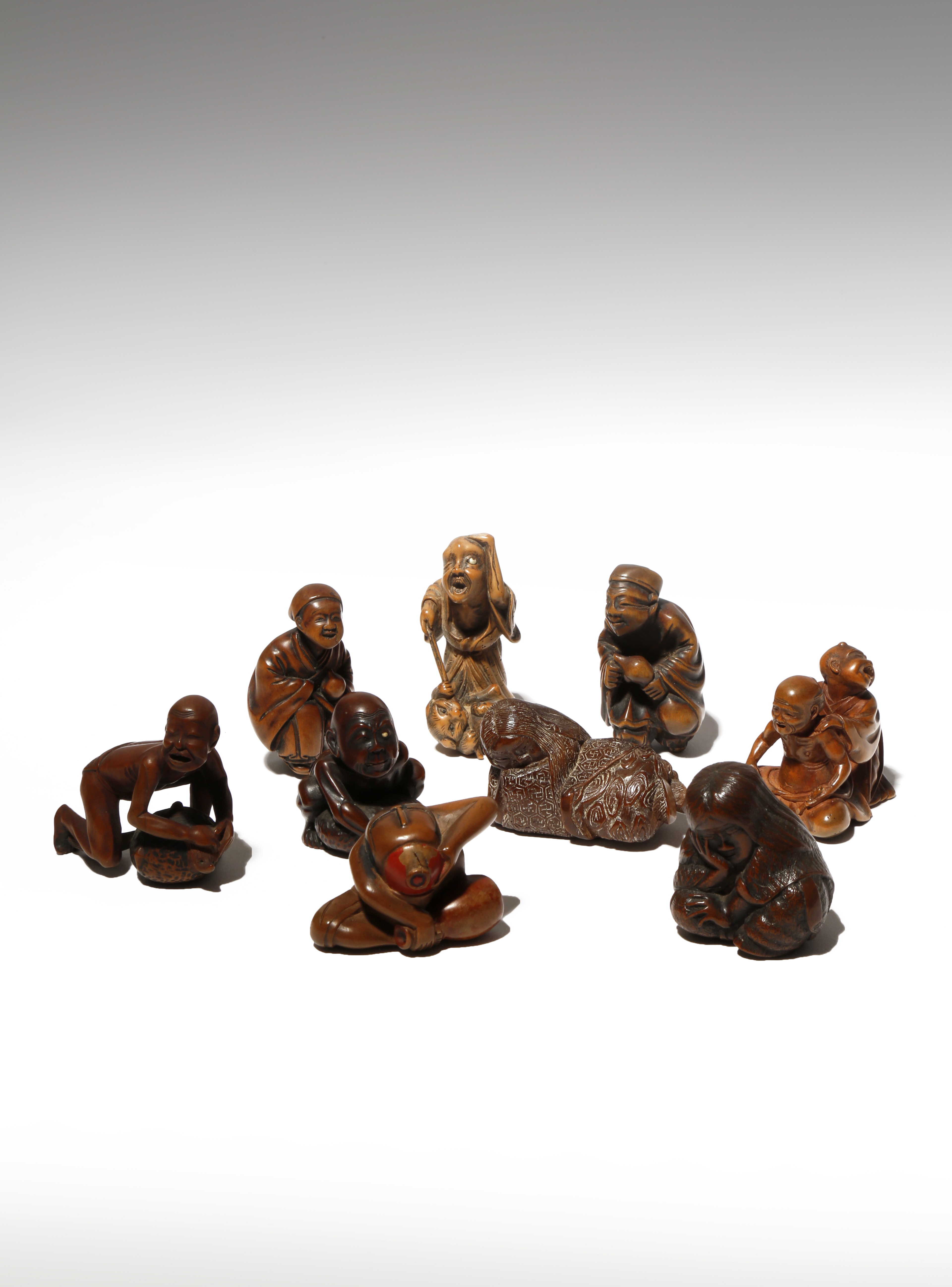 NINE JAPANESE WOOD NETSUKE OF FIGURES MEIJI PERIOD