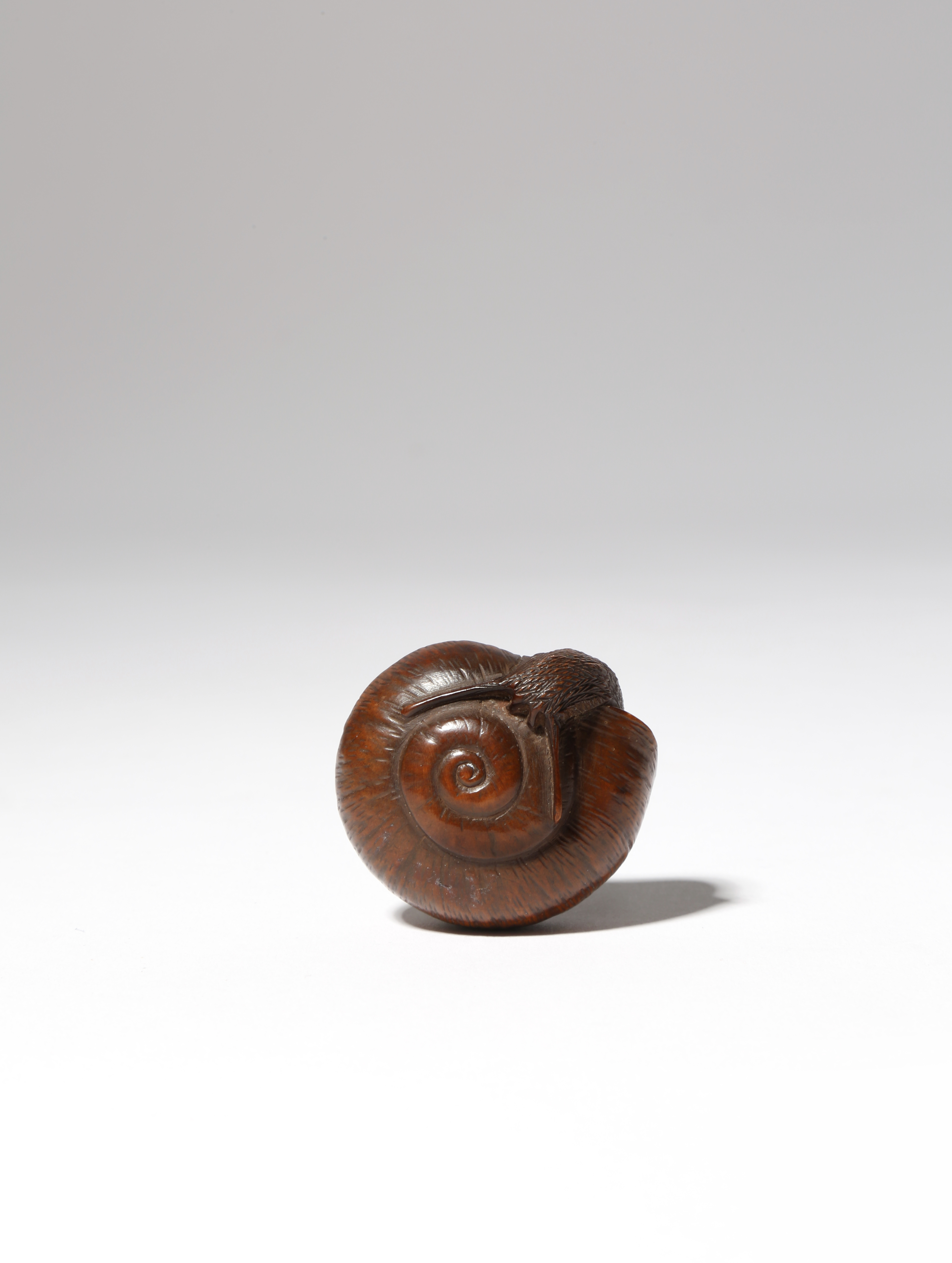 A JAPANESE WOOD NETSUKE OF A SNAIL