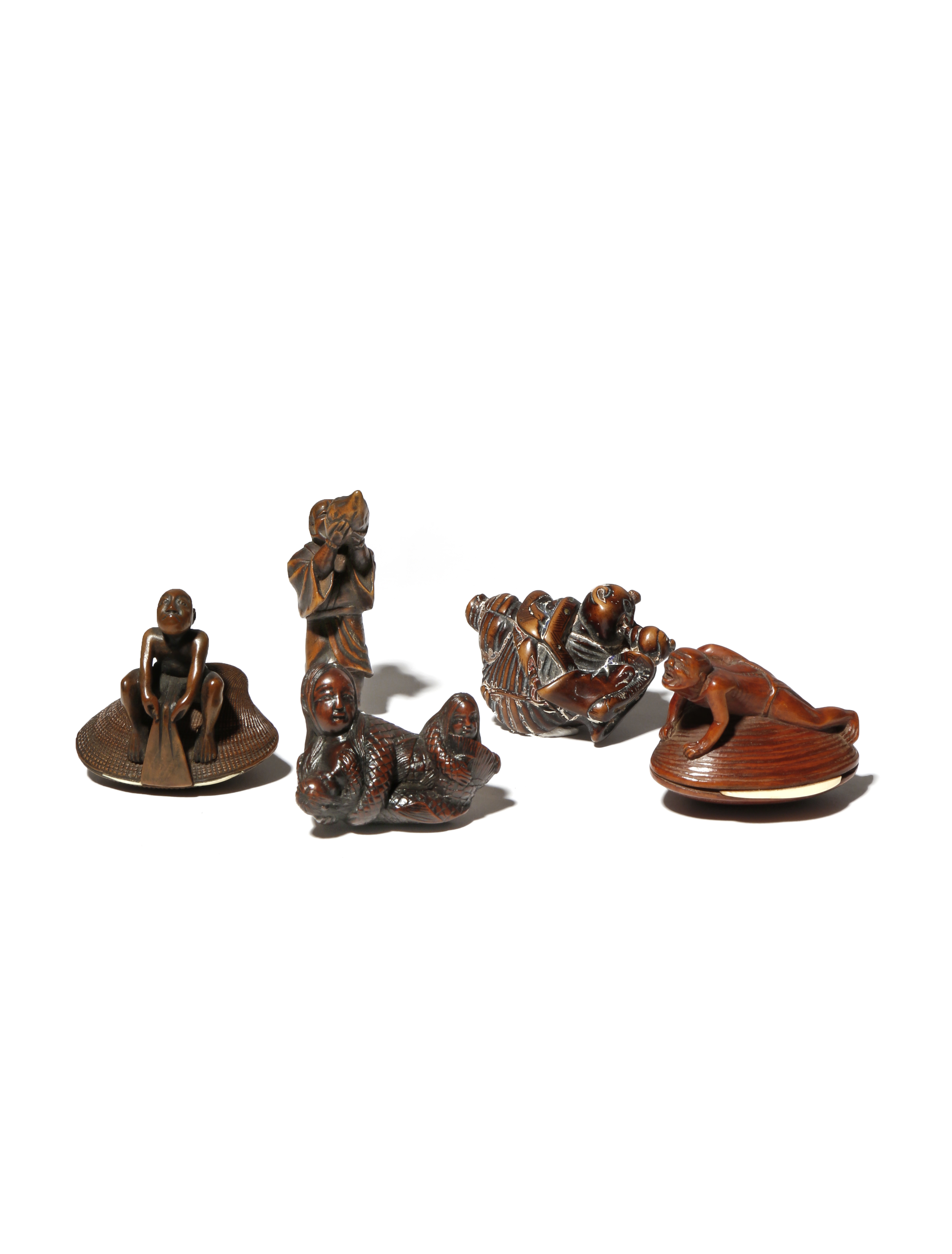 Two carved as a fisherman whose loincloth is trapped in a giant bivalve; two others depicting Benkei blowing in a conch shell, the last an unusual depiction of a mermaid with her children, one clambering over her tail and the other suckling at her teat, some with signatures including Kizan / Yoshiyama, Masakazu, and Tomokazu, 5.3cm max. (5)