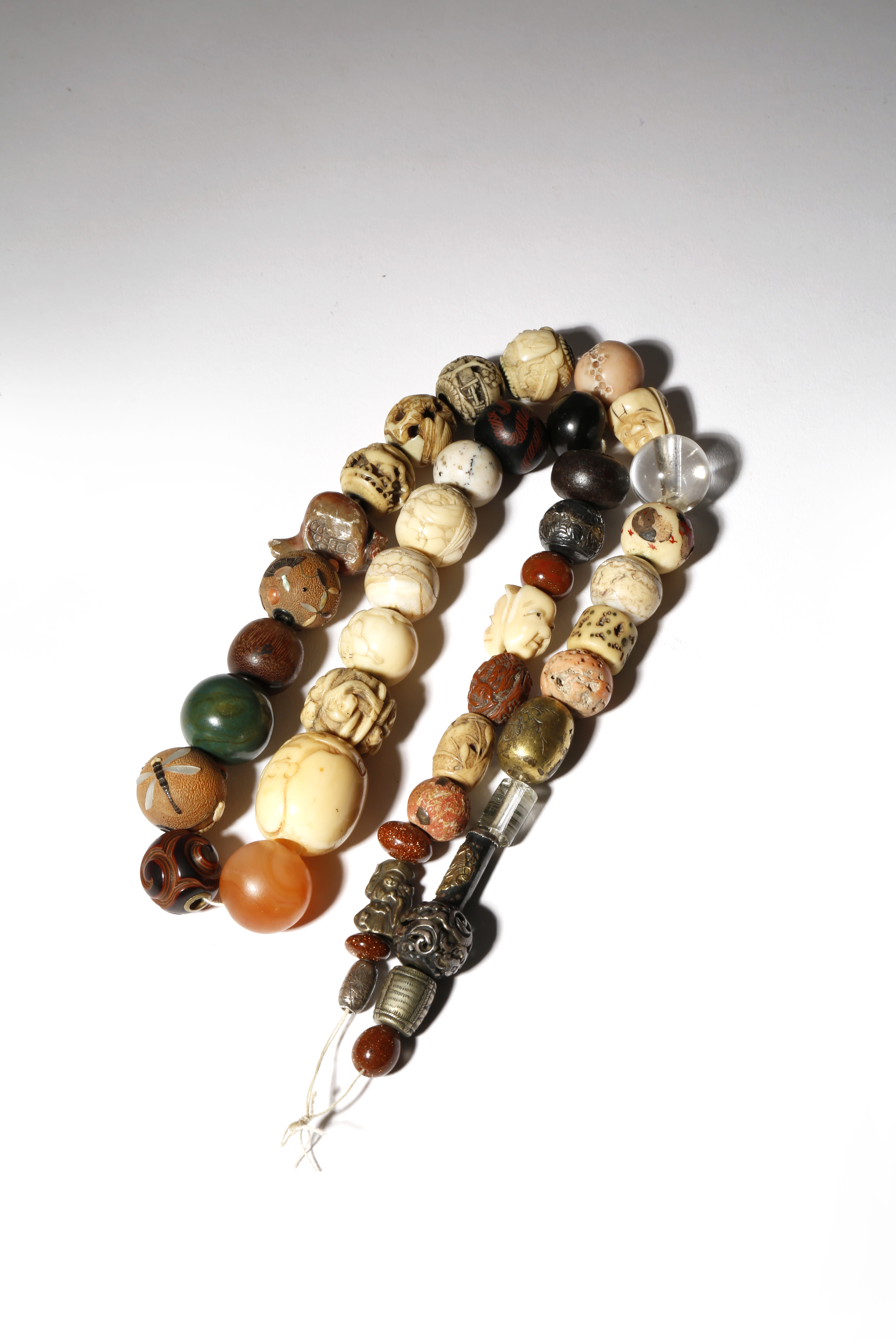Strung as a necklace and made of mixed materials including ivory, coral, aventurine, glass, metal and others, variously depicting figures, animals, objects and abstract designs, two in wood inlaid with mother of pearl, coral, horn, and ivory and signed Shibayama, some others also with signatures, 2.5cm max. (43)