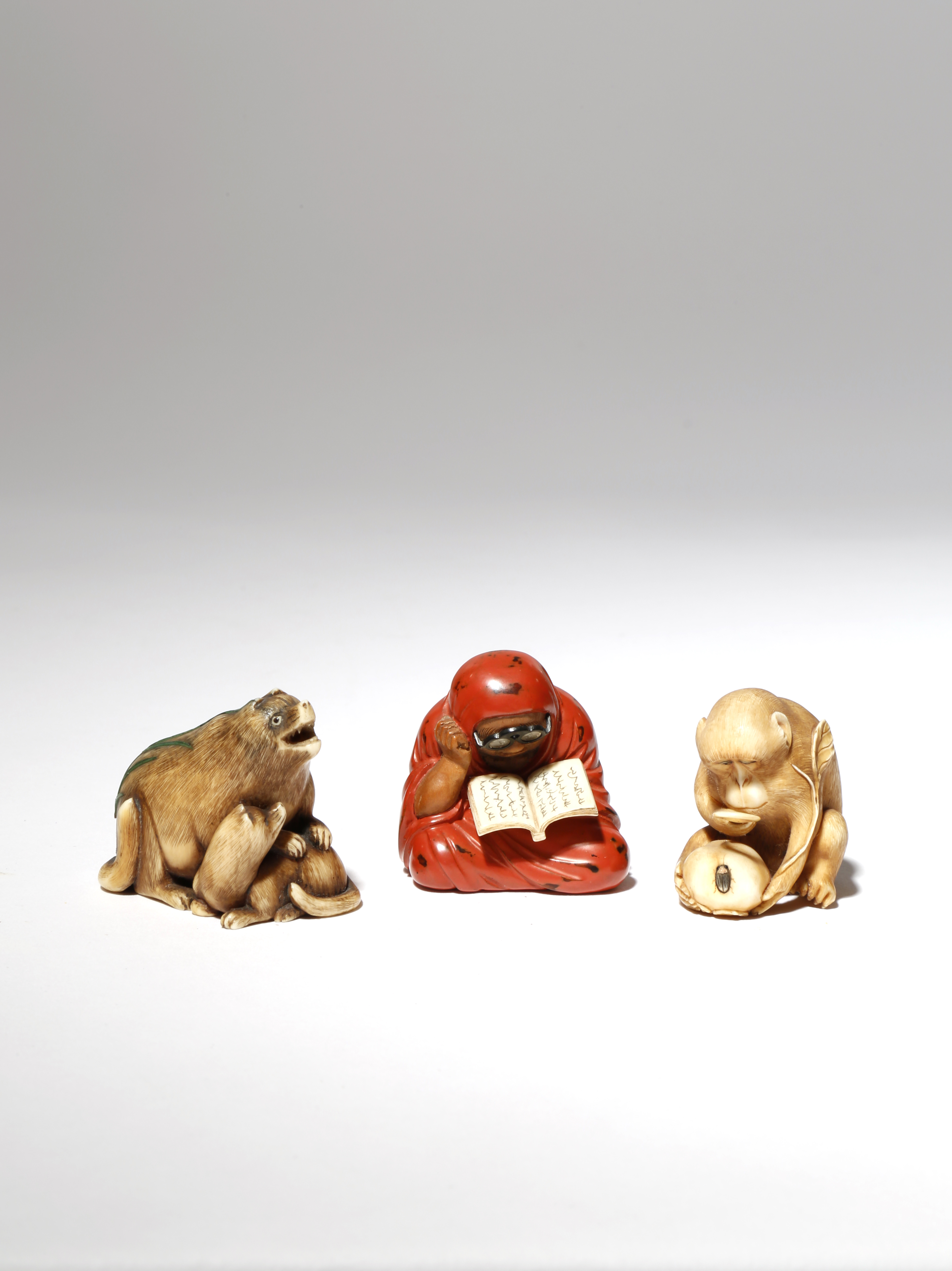 The first in lacquered wood and ivory and carved as Daruma, the Father of Zen Buddhism with spectacles and absorbed in the book opened before him; the second of a monkey examining a beetle on a persimmon with a magnifying glass, in ivory and with the insect inlaid, signed Shomin / Masatami in a rectangular reserve underneath; the third of a large tanuki with its young, with long grasses inlaid in stained ivory and horn to the back, signed Togyoku, 5cm max. (3)