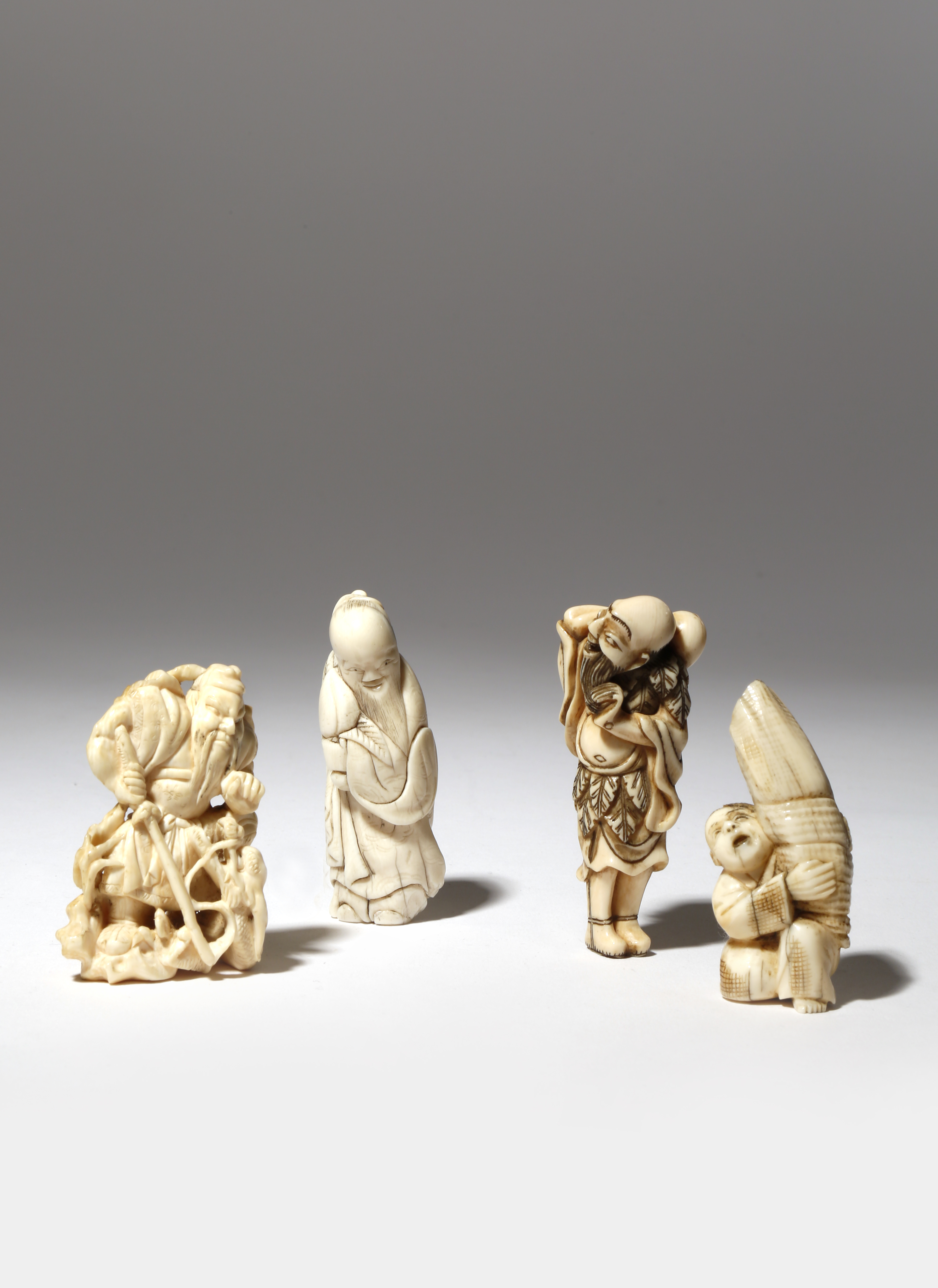Two carved as Tobosaku Sennin and the Peach of Immortality, the third Susanoo slaying the Yamata no Orochi, the remaining one depicting a man struggling to carry a large shell, 7cm max. (4)