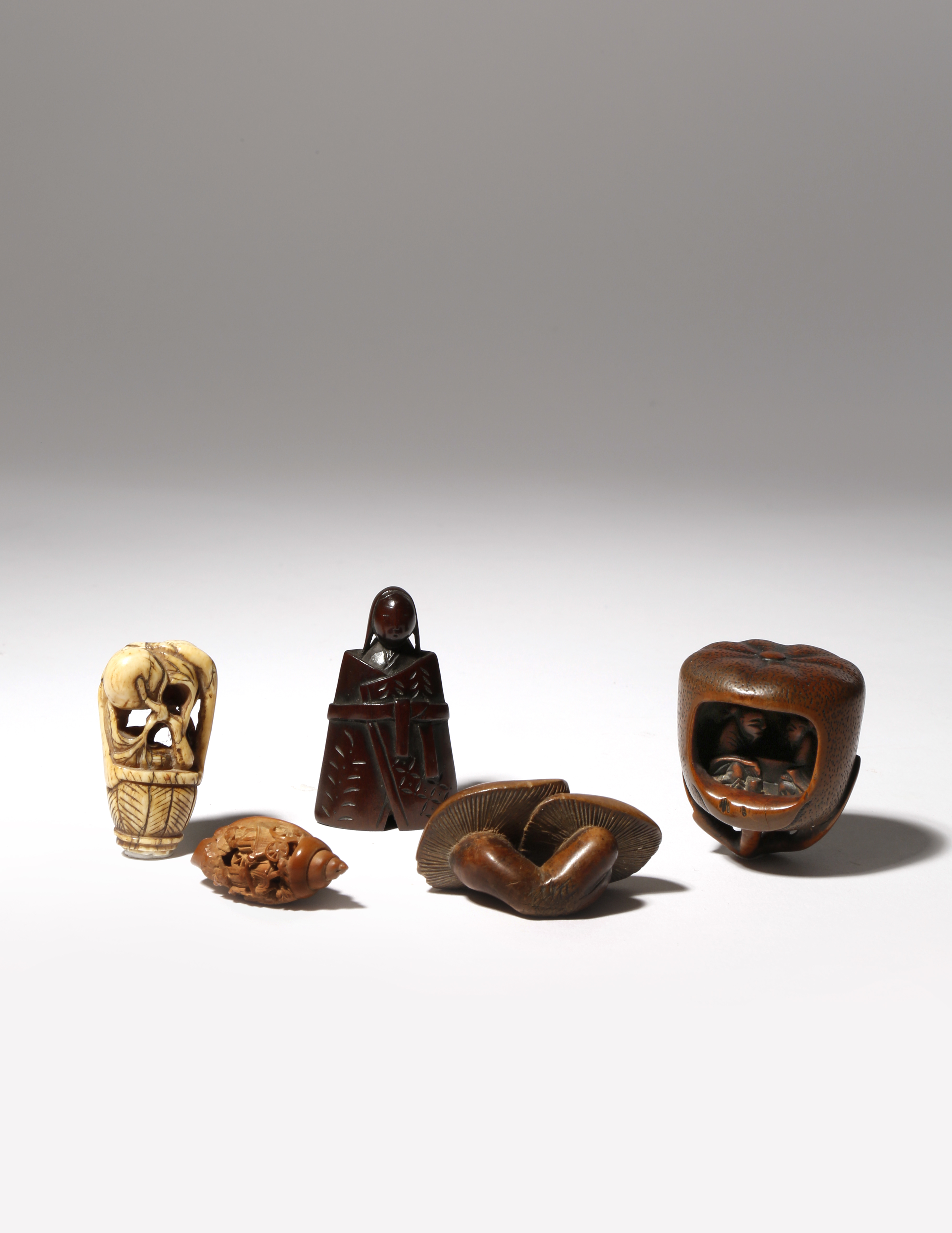 Three in wood, variously depicting two mushrooms, two sages conversing inside a giant fruit and a stylised doll; the fourth in ivory and carved as a basket containing fruiting branches of persimmon; together with a Chinese nut carved as two figures emerging from a giant shell, 5cm max. (5)