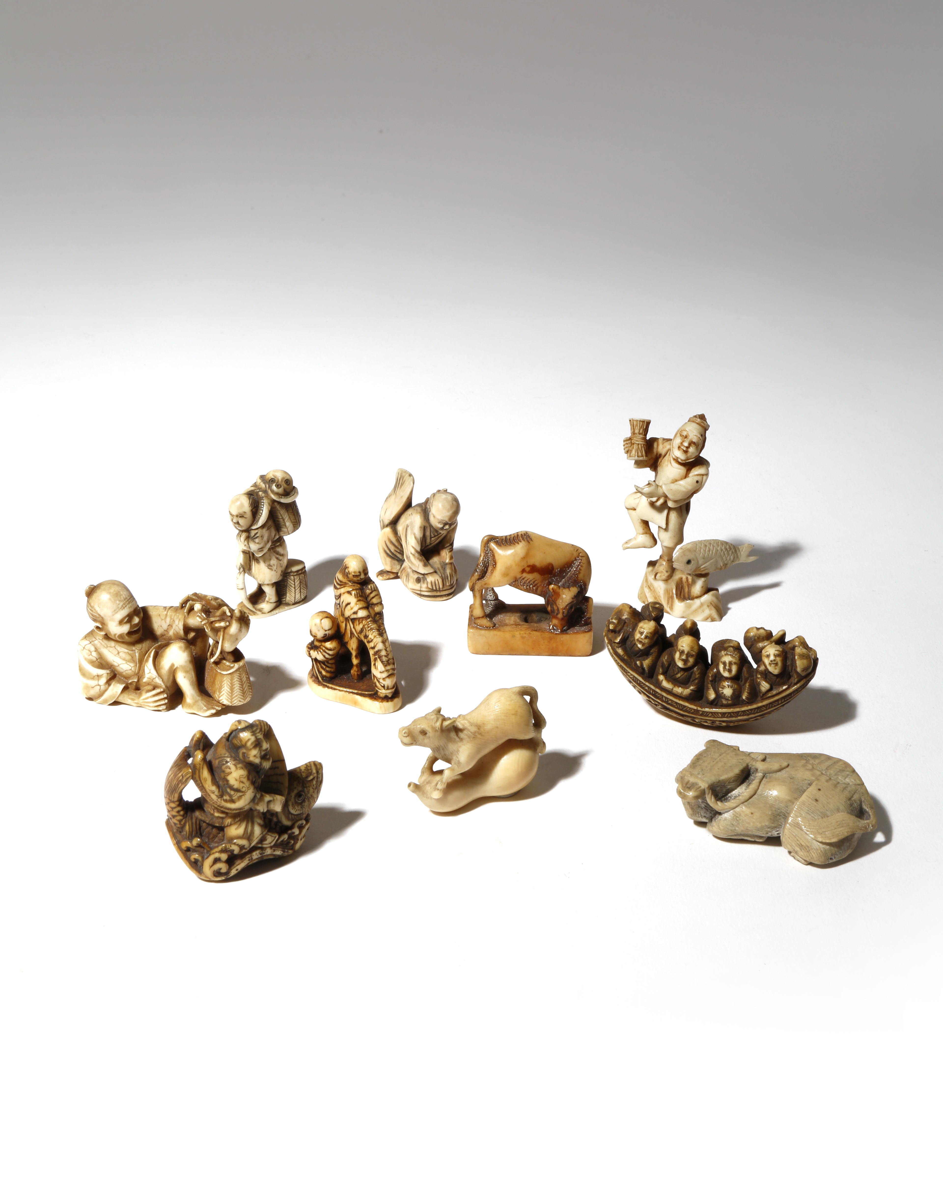Variously depicting figures and animals, fishermen and their catch, one Kinko Sennin riding his carp, signed Masatsugu, another carved as travellers on a boat, signed Tomochika, a horse rider and his attendant, a large ox on a rectangular base and Chokaro Sennin's horse galloping on its gourd, together with a stag antler netsuke of a recumbent ox, some others with signatures including Yasuaki, Masatsugu and Kogyokko, 6cm max. (10)