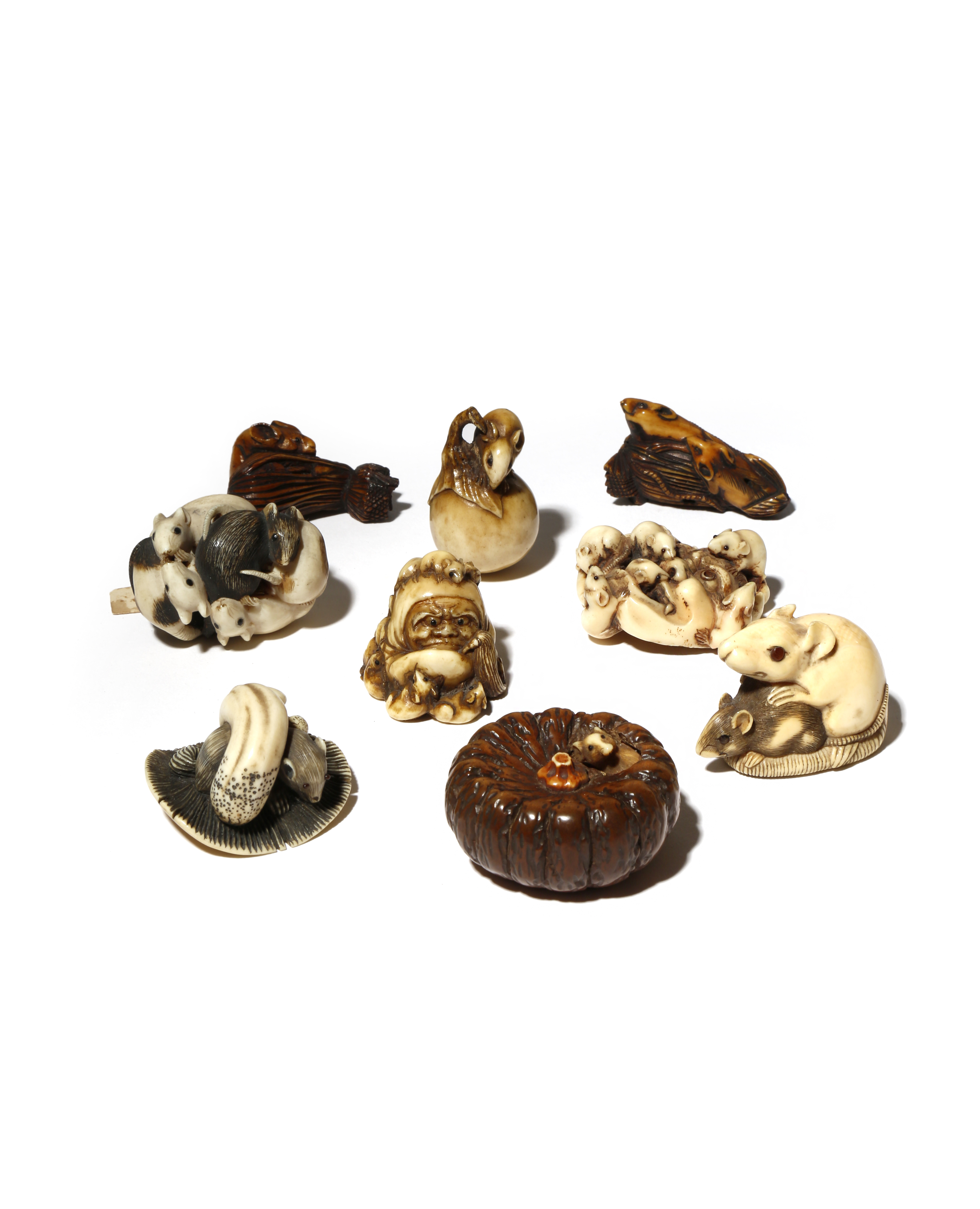 One with a small rodent peeking out of a wood pumpkin; three each depicting a colony of rats; a large rat with its young and the remaining four climbing over fruits and mushrooms, some with signatures including Tomochika, Ikkosai and Masamitsu, 4cm max. (9)
