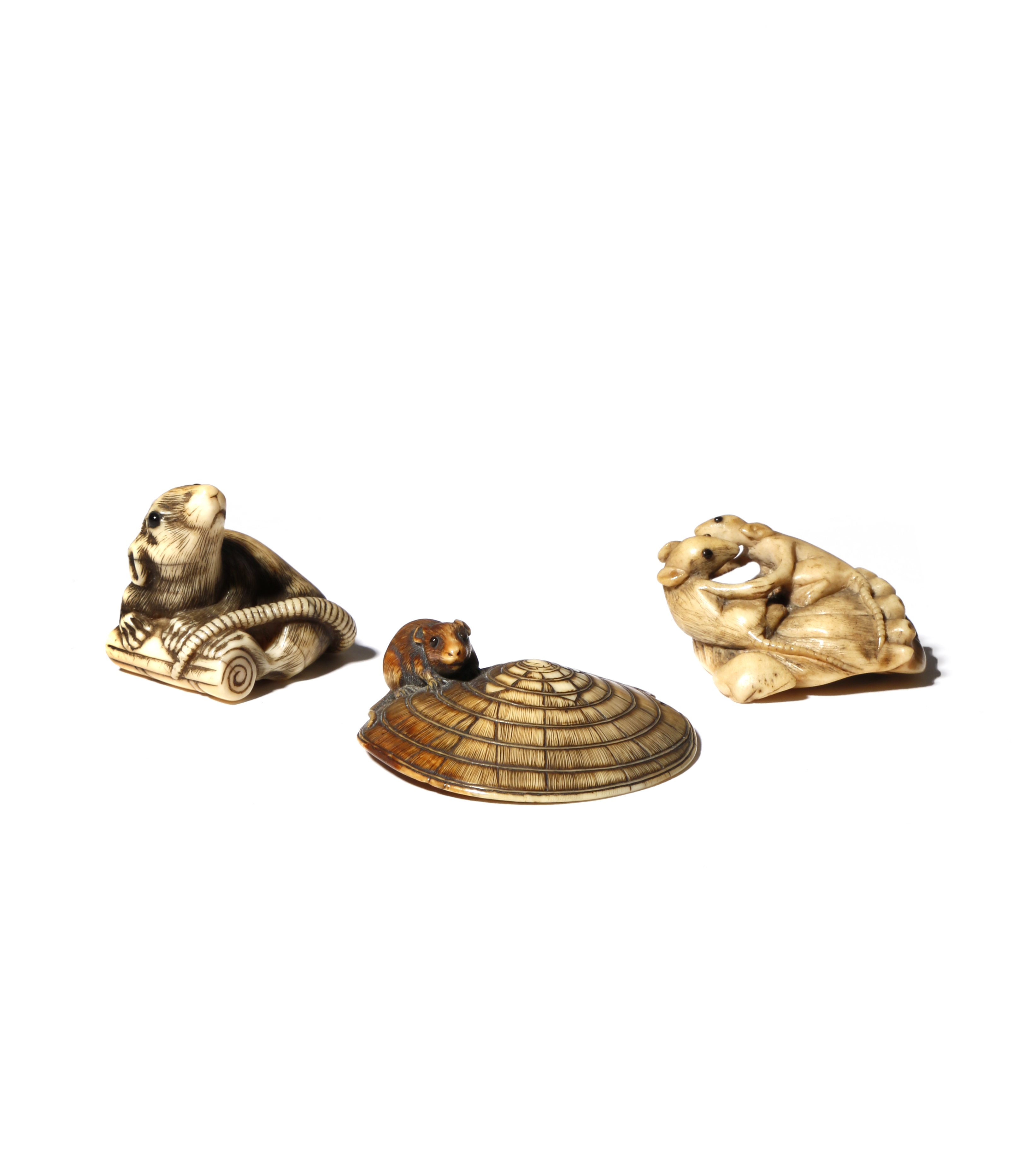 Two in ivory, the first depicted on a large straw hat, realistically carved and with its eyes inlaid, signed Masanao in an oblong reserve underneath; the other resting its paws on a rolled-up scroll, with its head raised and the eyes also inlaid; the third in stag antler and carved as two rodents on a large awabi shell, seemingly holding paws, 4.7cm max. (3)