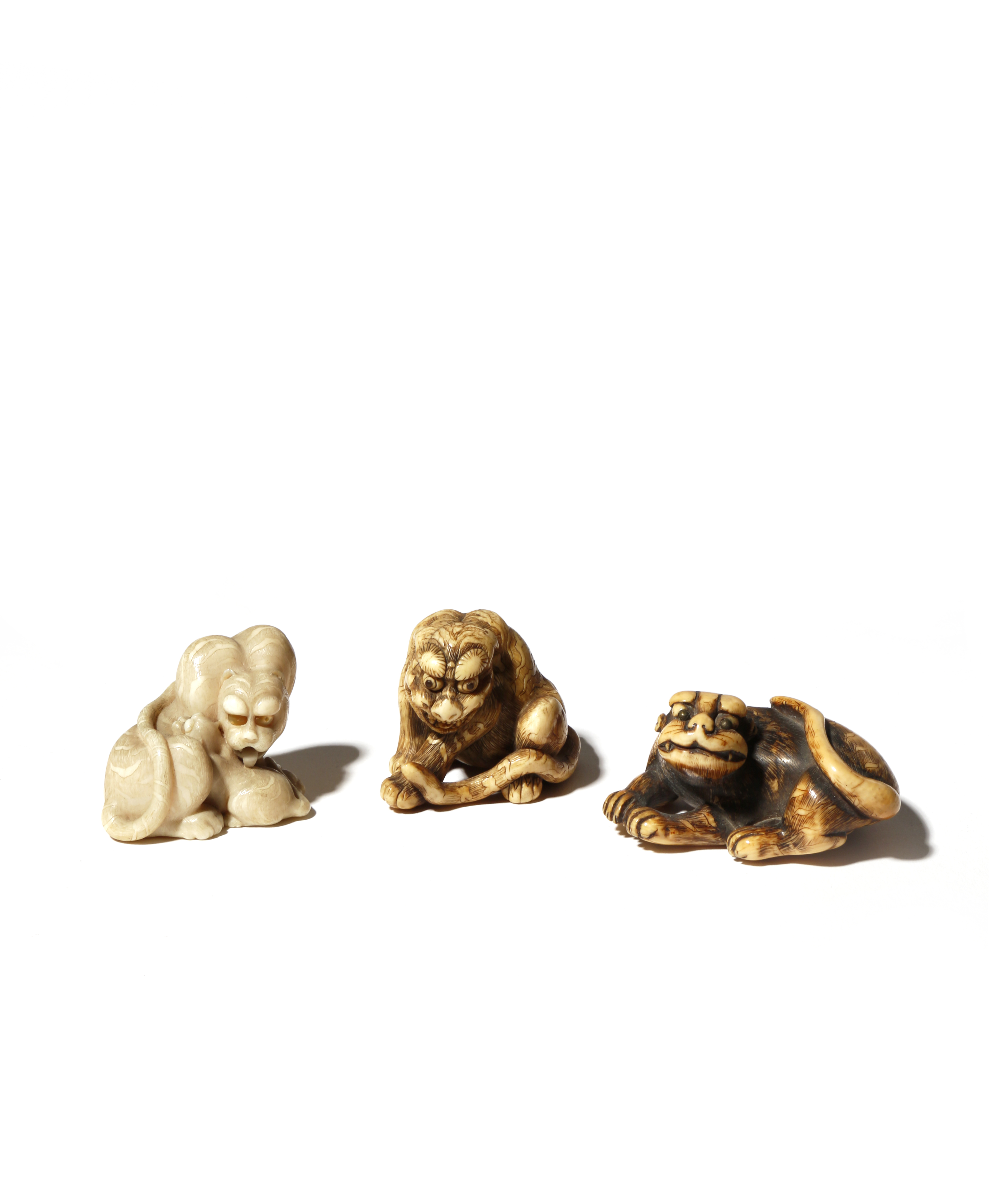 λ THREE JAPANESE IVORY NETSUKE OF TIGERS EDO PERIOD AND LATER