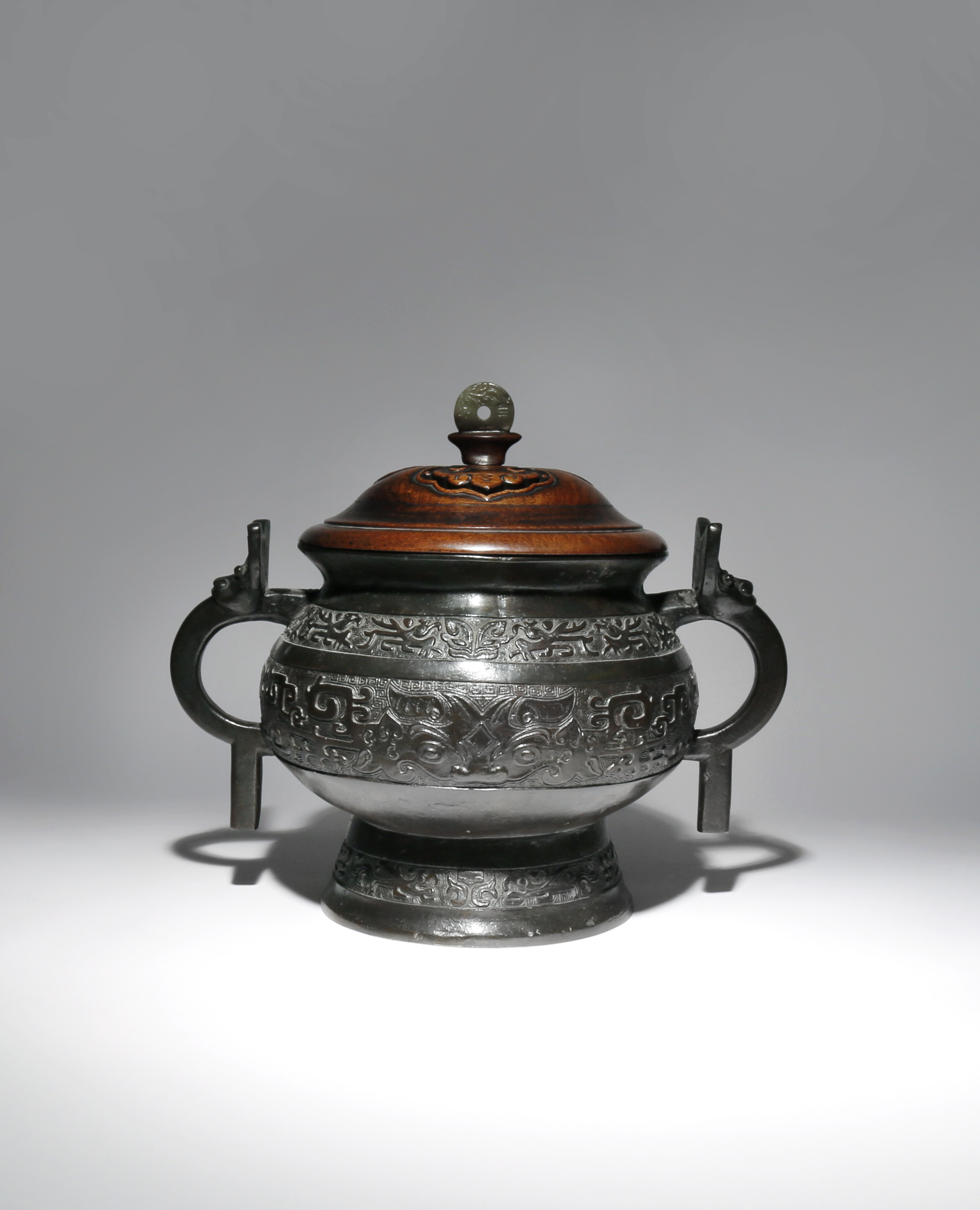 Cast with taotie masks and other archaistic motifs against a leiwen ground, the body flanked by two loop handles issuing from the mouths of mythical creatures, with two lines of seal script characters to the interior, all raised on a tall flared foot, together with a wood cover surmounted by a hardstone finial, 34cm, 6kg. (2)