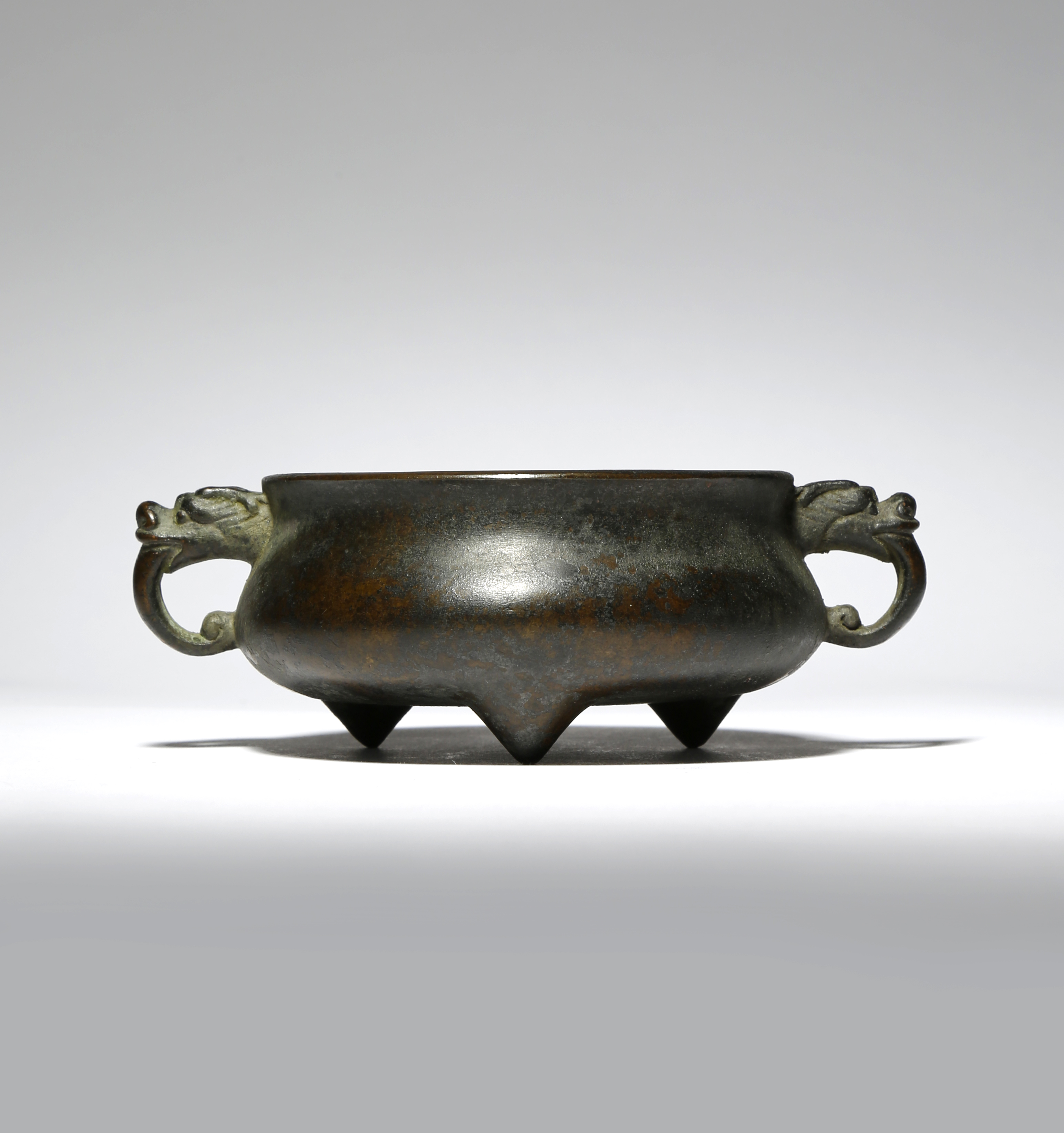 A CHINESE BRONZE TRIPOD INCENSE BURNER QING DYNASTY The compressed body flanked by two loop...
