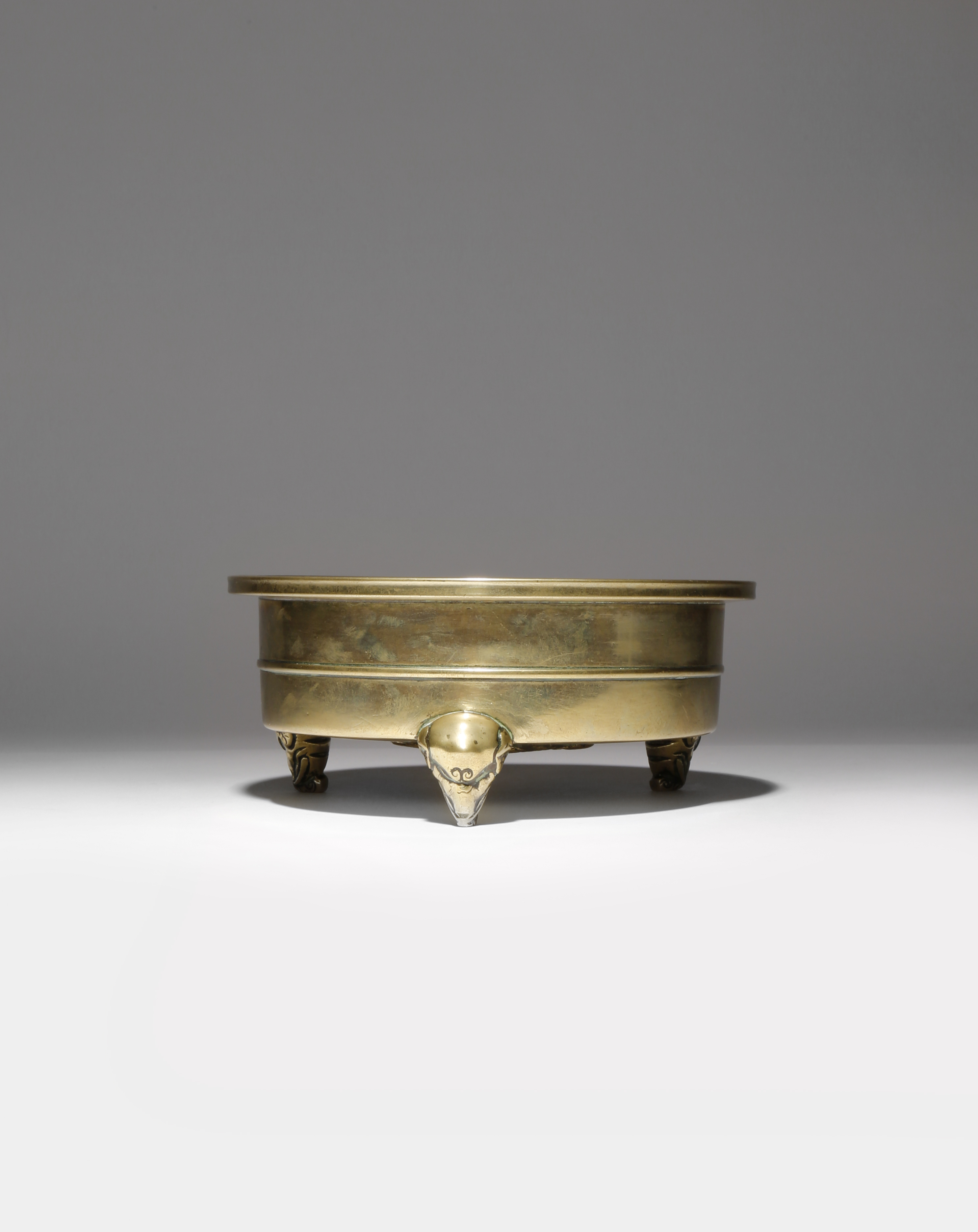 With raised bands to the cylindrical body and flat everted rim, raised on three short feet cast as elephant heads, the base with a six character Xuande mark encircled by two sinuous dragons chasing a sacred jewel, 17.7cm, 1.1kg.