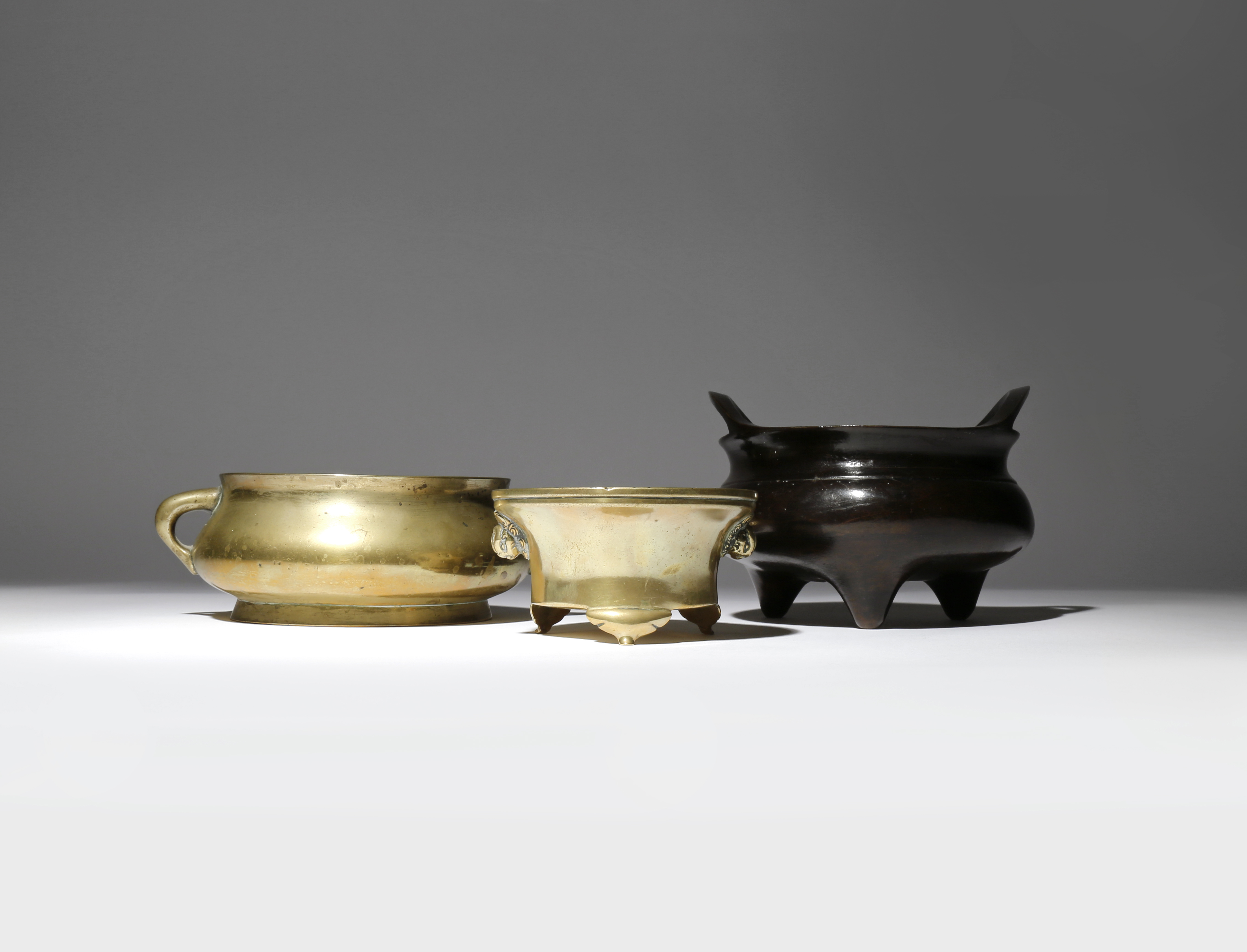 THREE CHINESE BRONZE INCENSE BURNERS QING DYNASTY One with a bombé-shaped body and two loop handles