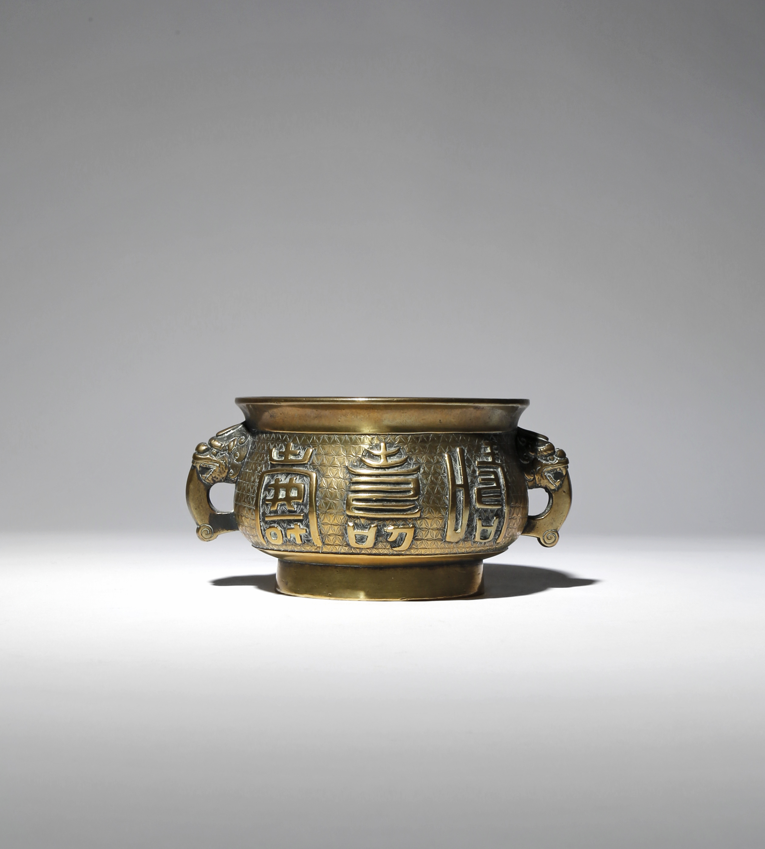 The compressed body flaring at the rim, decorated with large characters reserved on a finely incised ground of floral diaper, with two loop handles issuing from mythical beast masks, the base with a four character mark reading sheng shou wan nian, 14cm, 619g.