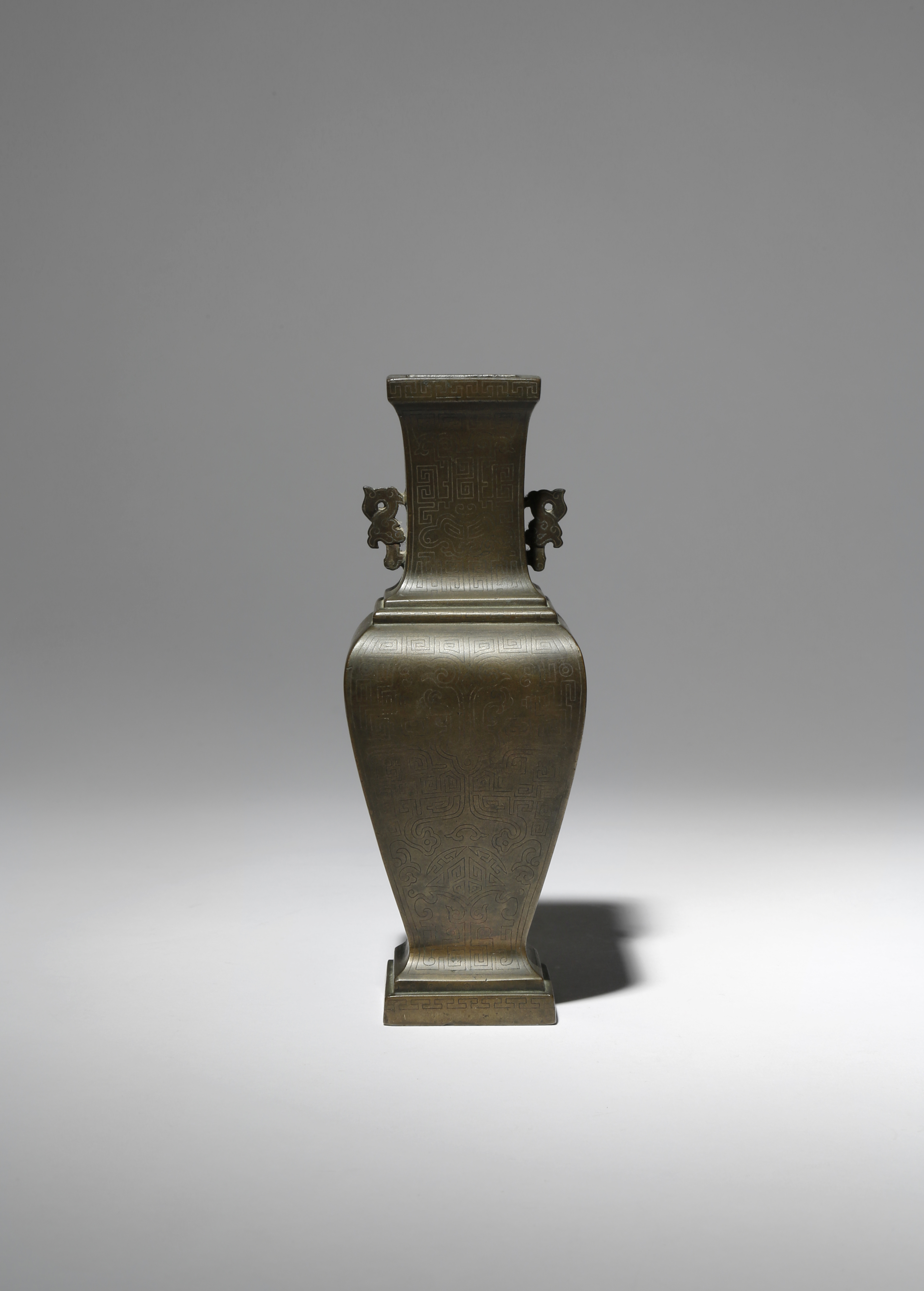 A CHINESE 'SHI SOU' SILVER INLAID BRONZE SQUARE-SECTION VASE 19TH CENTURY The exterior decorated...