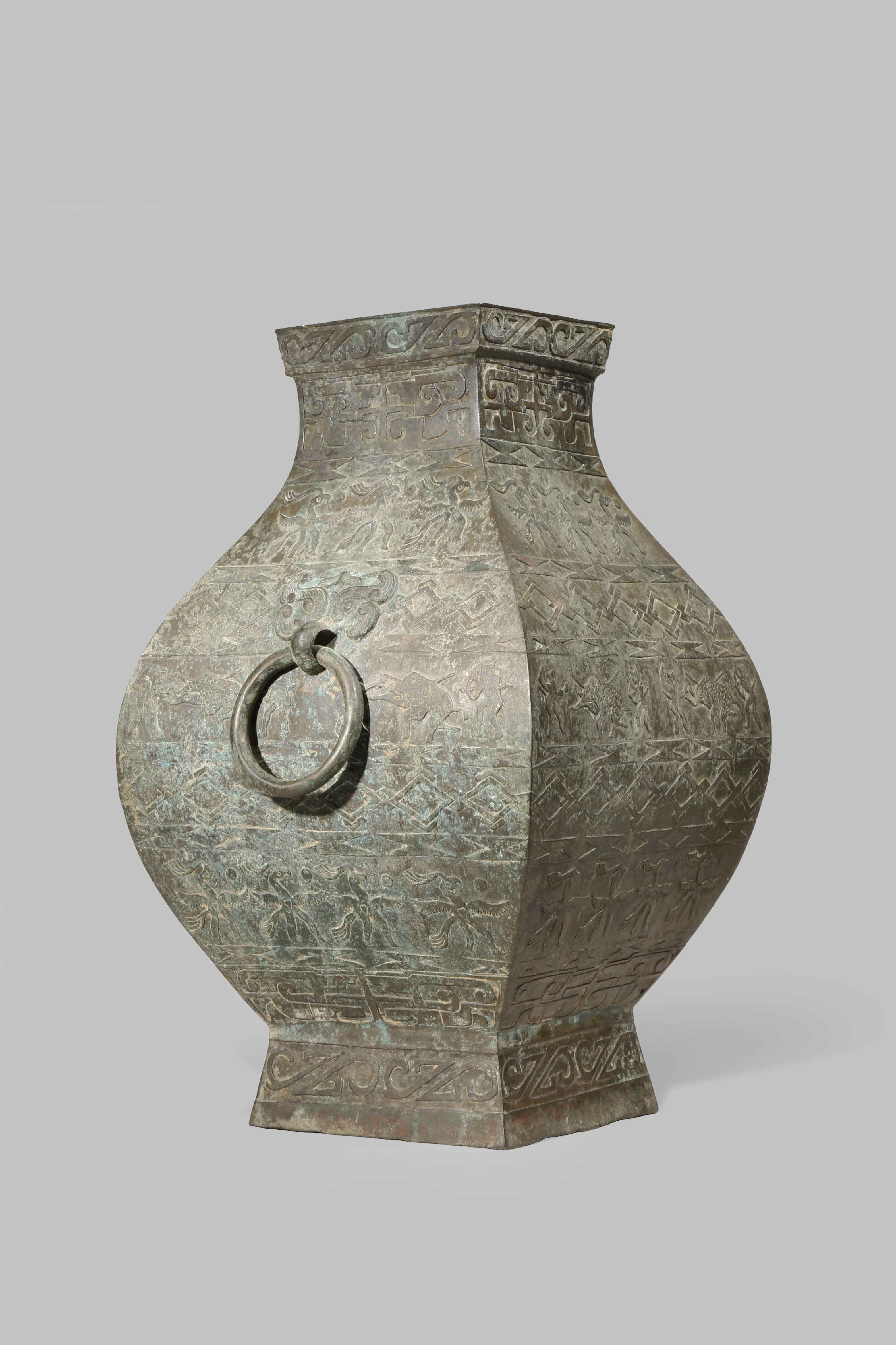 The bulbous square-section body with a neck decorated with hunting scenes and borders of geometric and zoomorphic patterns, with a pair of taotie mask handles with loose rings, all supported on a flared foot, 36cm, 3.4kg.