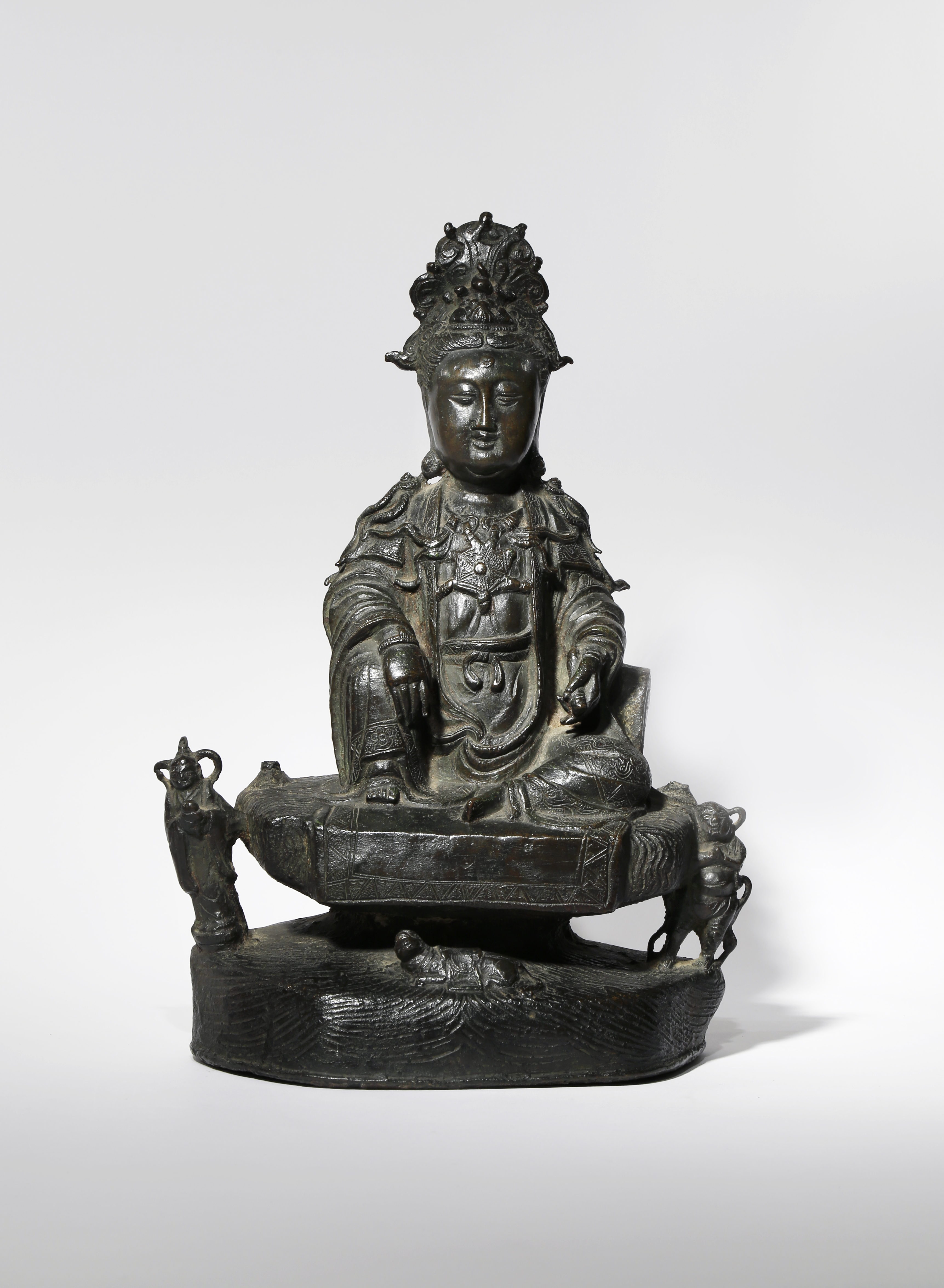 A LARGE CHINESE BRONZE FIGURE OF GUANYIN 17TH CENTURY The deity depicted seated in rajalilasana...