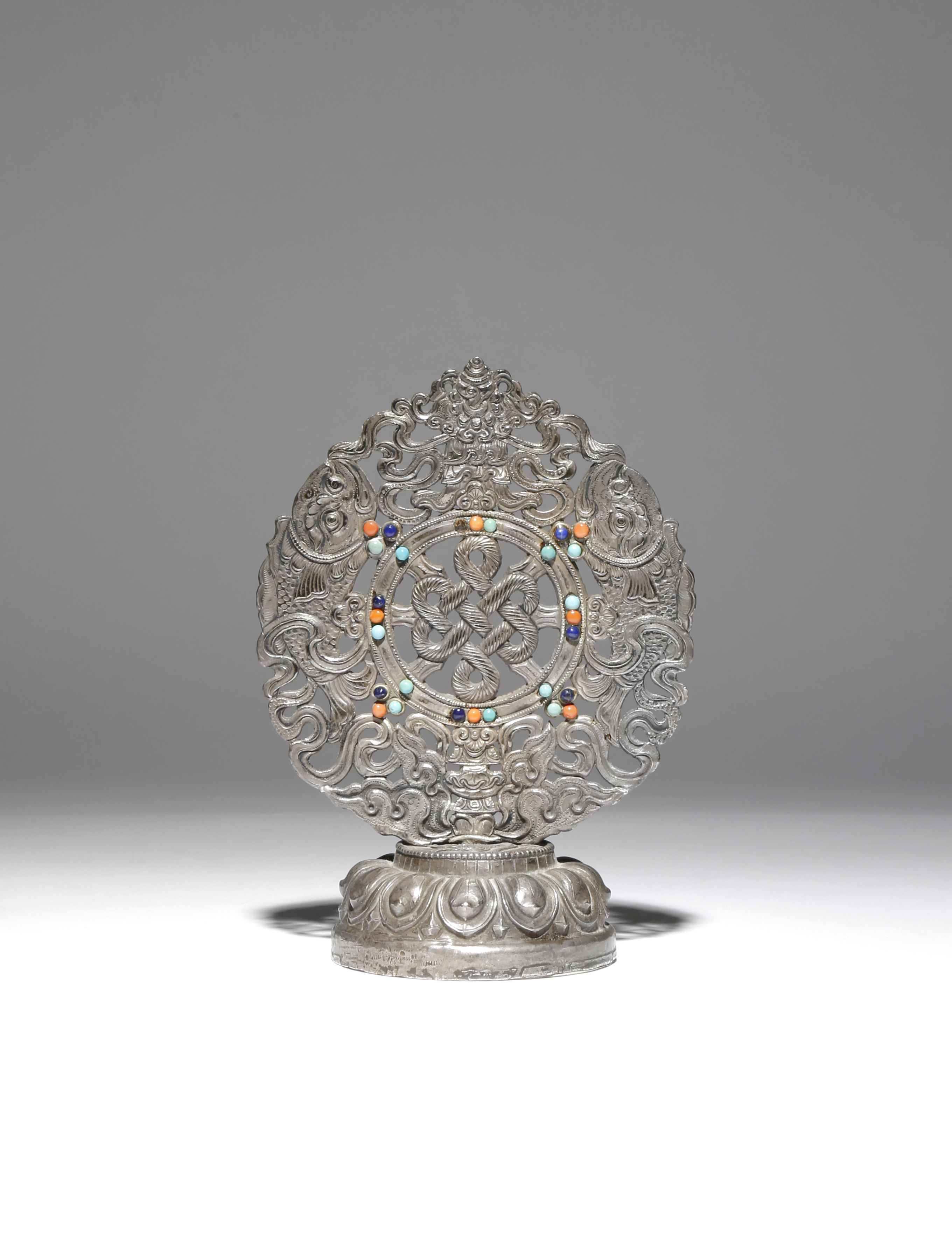 A TIBETAN SILVER BUDDHIST OFFERING 19TH CENTURY Decorated with five Buddhist emblems