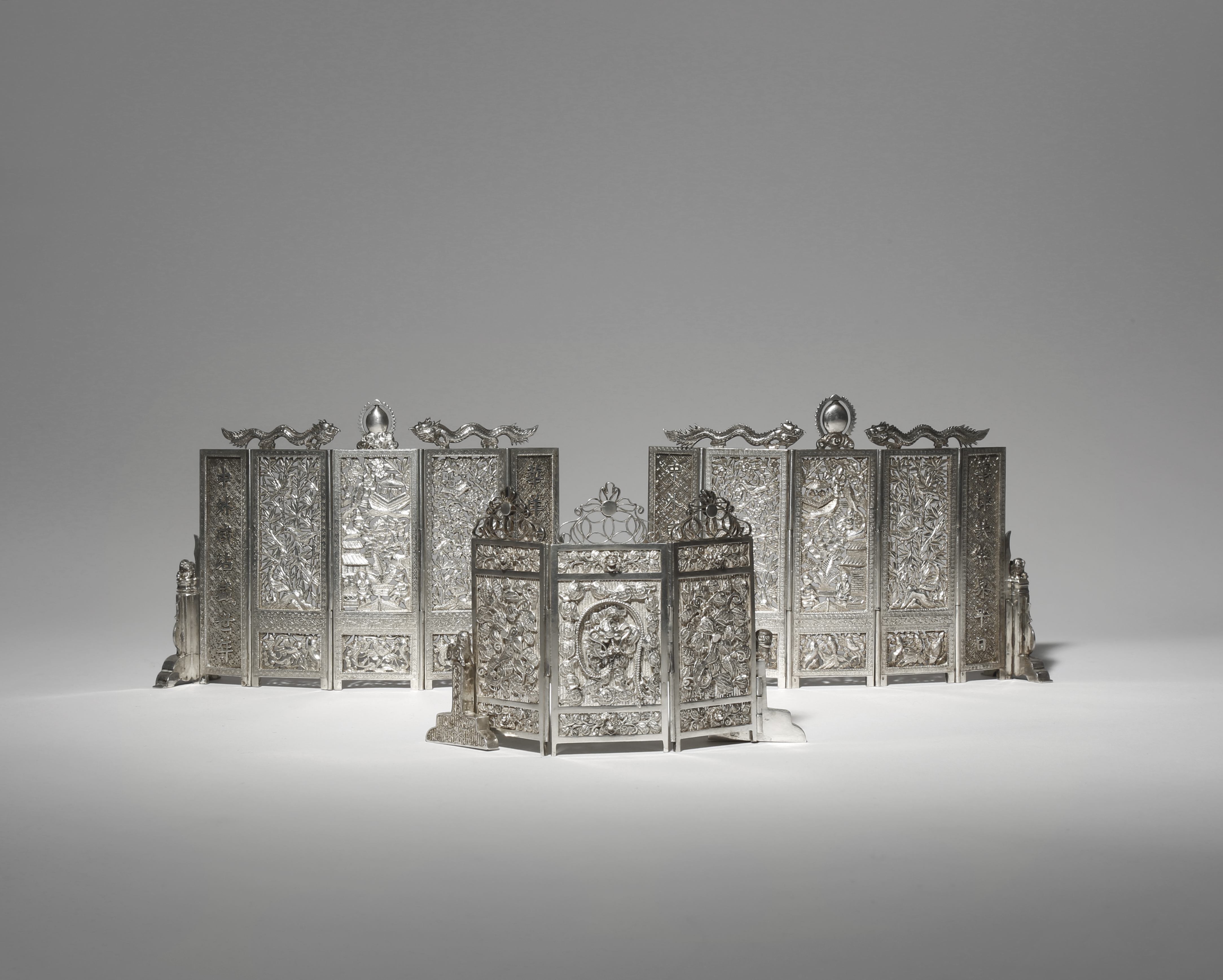 The two larger screens a near pair, the hinged panels pierced with birds and figures amongst various trees, all flanked by calligraphy and surmounted by two dragons chasing a sacred jewel, each with a punch mark for Zheng Tang to the reverse, the smaller screen with filigree decoration of a dragon amidst scrolling foliage, the feet with punch marks reading 'WF90' and Yong Sheng Long, 10.4cm x 15.6cm max, 169g, 161g and 57g. (3)