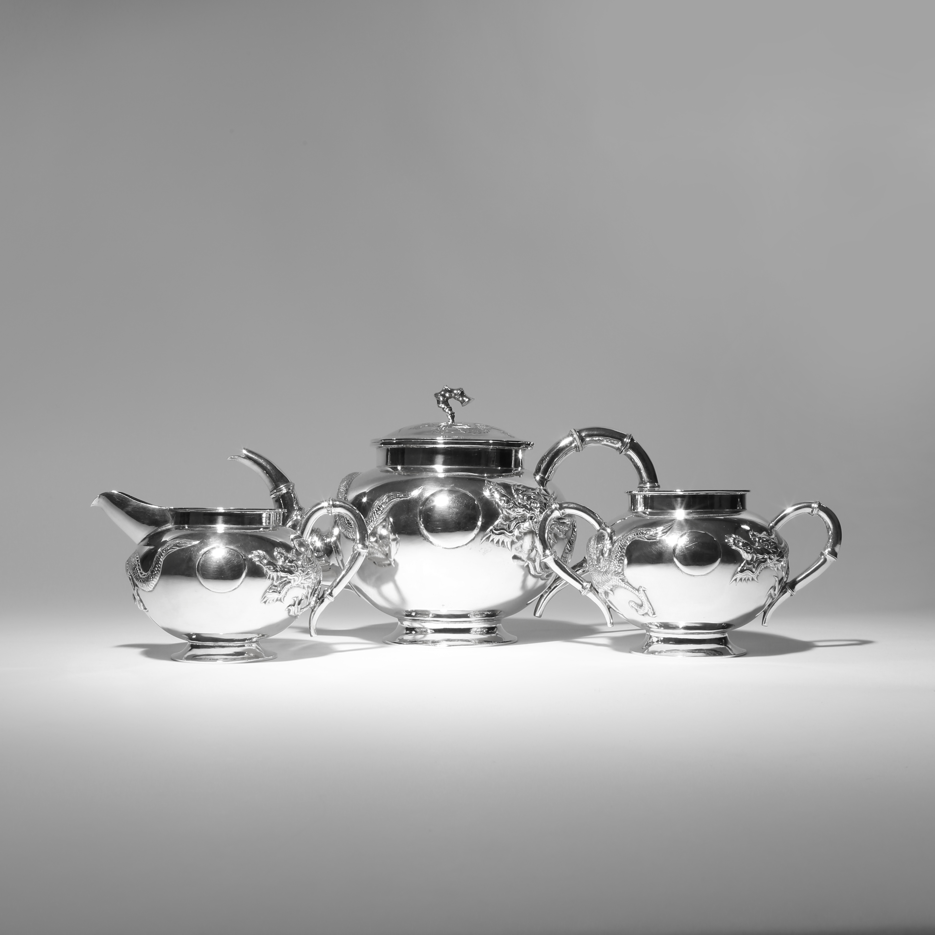 Comprising: a teapot, a sugar bowl and a cream jug, each decorated with a dragon in pursuit of a pearl, the spout, knop and handles formed as bamboo branches, with gilt to the interiors of the sugar bowl and cream jug, the teapot handle with ivory insulators, each with punch marks to the base reading 'Tsuntsun' and Zhen Zhen Guang, 26cm max, 501g, 191g and 137g. (3)
